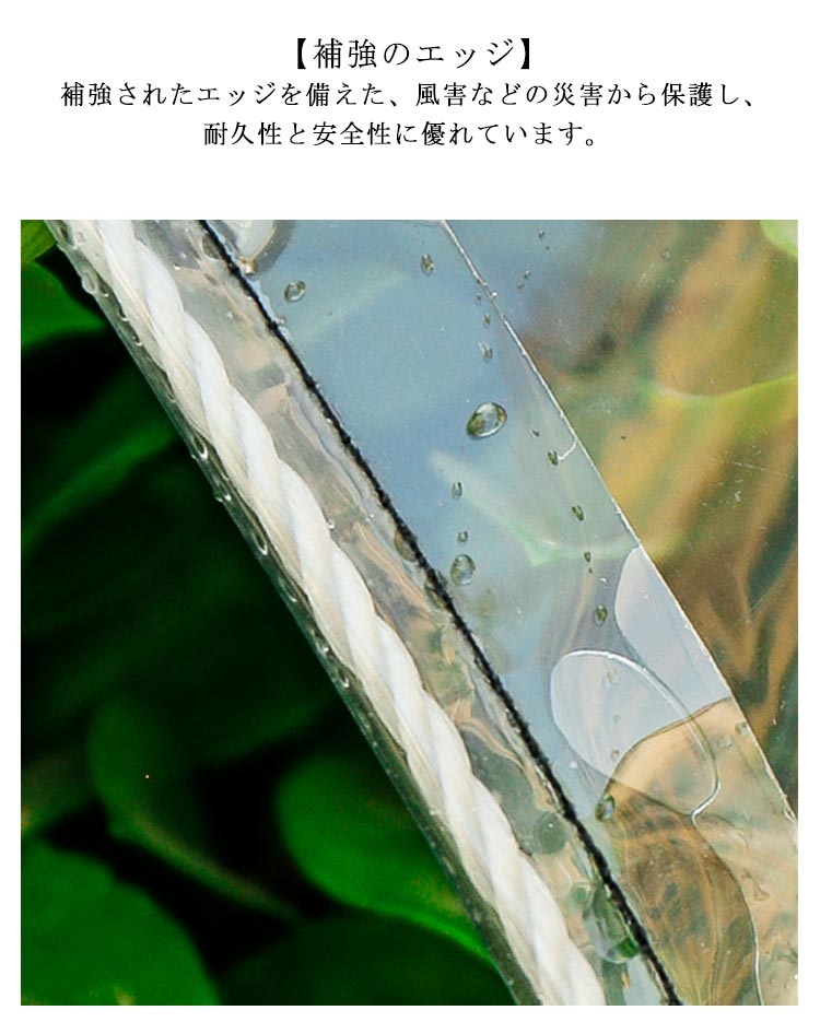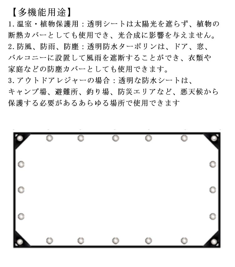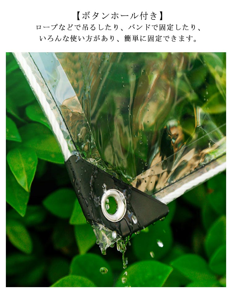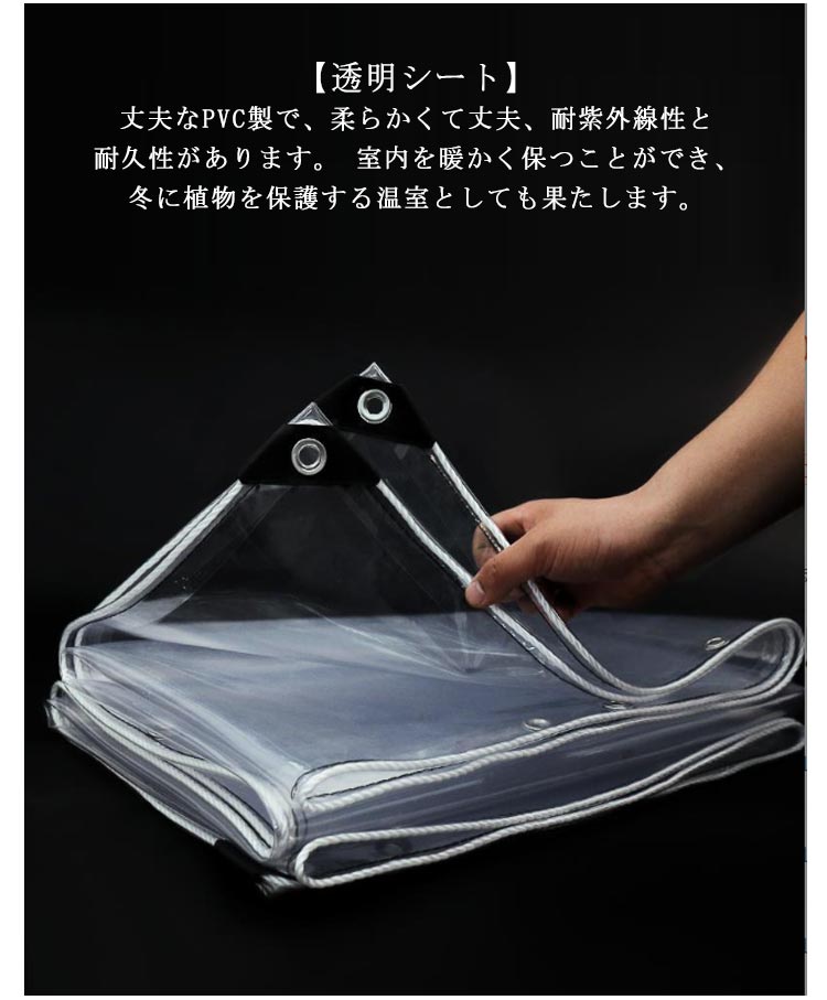 【透明シート】丈夫なPVC製で、柔らかくて丈夫、耐紫外線性と耐久性があります。 室内を暖かく保つことができ、冬に植物を保護する温室としても果たします。【ボタンホール付き】ロープなどで吊るしたり、バンドで固定したり、いろんな使い方があり、簡単に固定できます。【補強のエッジ】補強されたエッジを備えた、風害などの災害から保護し、耐久性と安全性に優れています。 【収納しやすい】自由に曲げたり折りたたんだりでき、小さな収納スペースしか占有しません。【多機能用途】1.温室・植物保護用:透明シートは太陽光を遮らず、植物の断熱カバーとしても使用でき、光合成に影響を与えません。 2.防風、防雨、防塵:透明防水ターポリンは、ドア、窓、バルコニーに設置して風雨を遮断することができ、衣類や家庭などの防塵カバーとしても使用できます。 3.アウトドアレジャーの場合:透明な防水シートは、キャンプ場、避難所、釣り場、防災エリアなど、悪天候から保護する必要があるあらゆる場所で使用できます