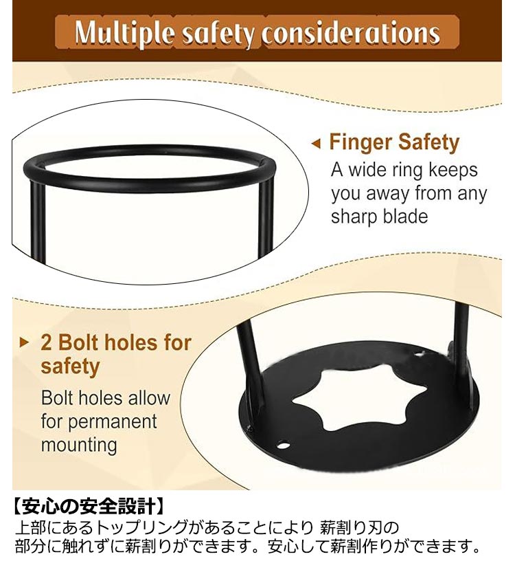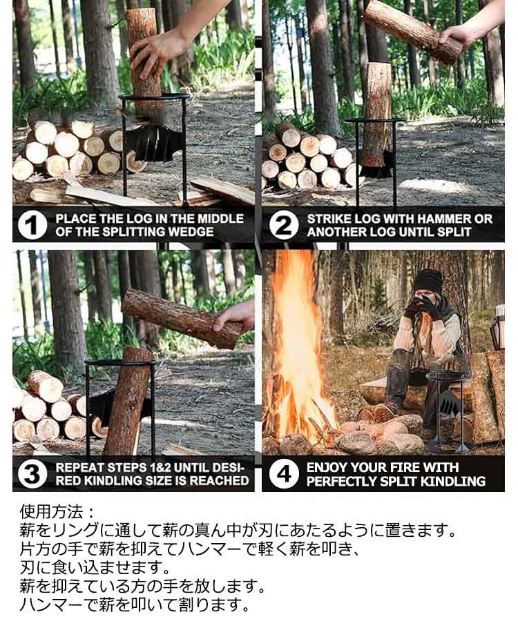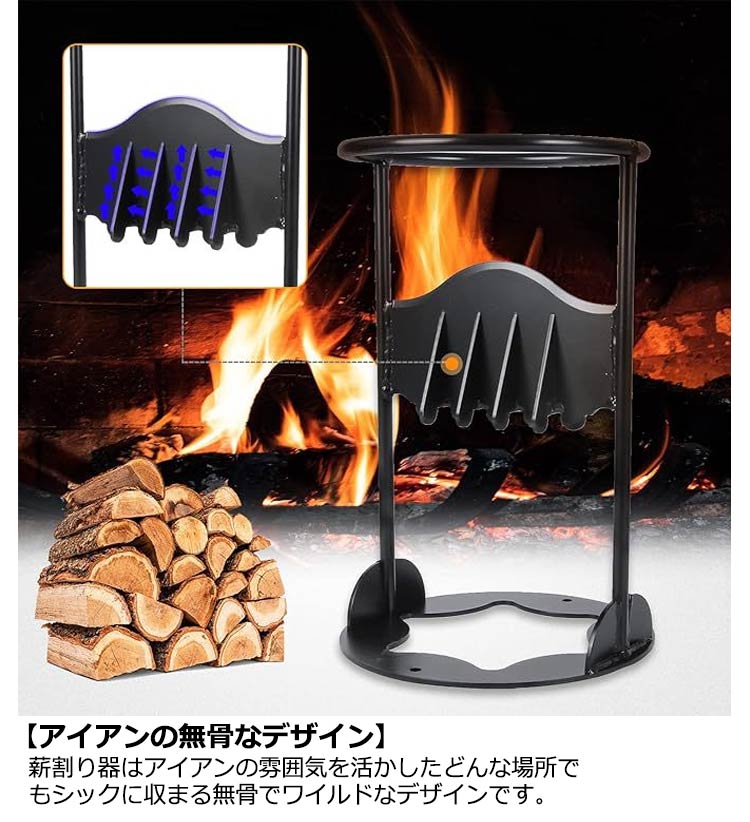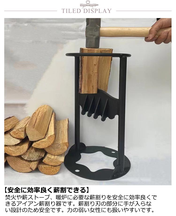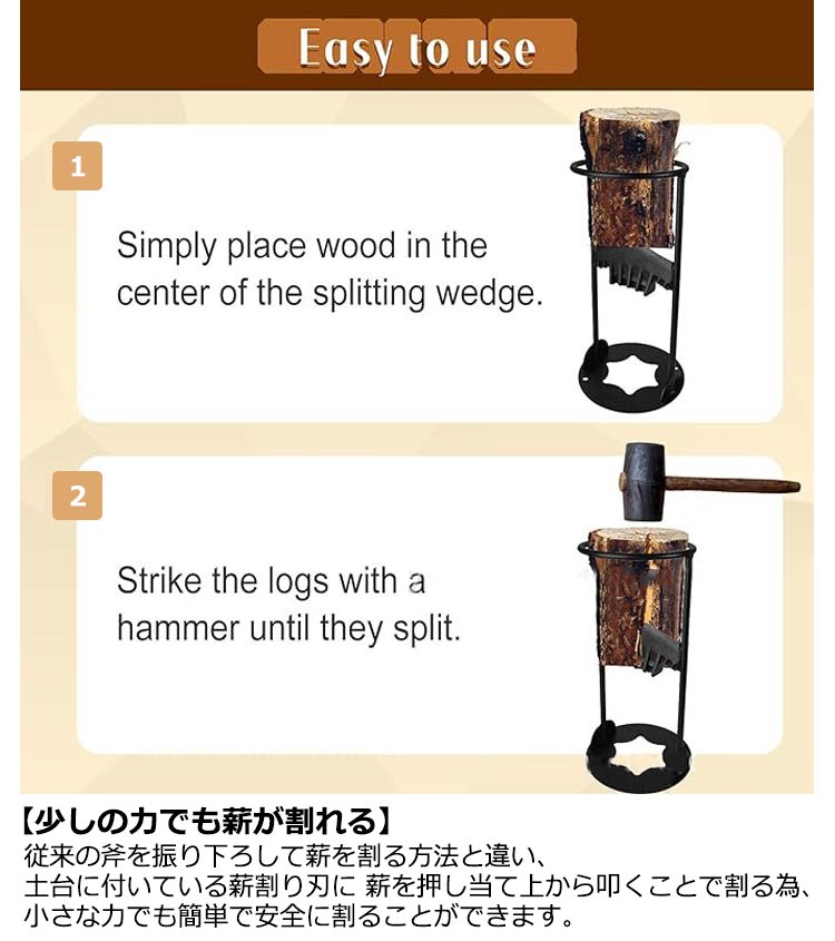 【安全に効率良く薪割できる】焚火や薪ストーブ、暖炉に必要な薪割りを安全に効率良くできるアイアン薪割り器です。薪割り刃の部分に手が入らない設計のため安全です。力の弱い女性にも扱いやすいです。【少しの力でも薪が割れる】従来の斧を振り下ろして薪を割る方法と違い、土台に付いている薪割り刃に 薪を押し当て上から叩くことで割る為、 小さな力でも簡単で安全に割ることができます。【安心の安全設計】上部にあるトップリングがあることにより 薪割り刃の部分に触れずに薪割りができます。安心して薪割作りができます。【アイアンの無骨なデザイン】薪割り器はアイアンの雰囲気を活かした どんな場所でもシックに収まる 無骨でワイルドなデザインです。使用方法:薪をリングに通して薪の真ん中が刃にあたるように置きます。片方の手で薪を抑えてハンマーで軽く薪を叩き、刃に食い込ませます。薪を抑えている方の手を放します。ハンマーで薪を叩いて割ります。