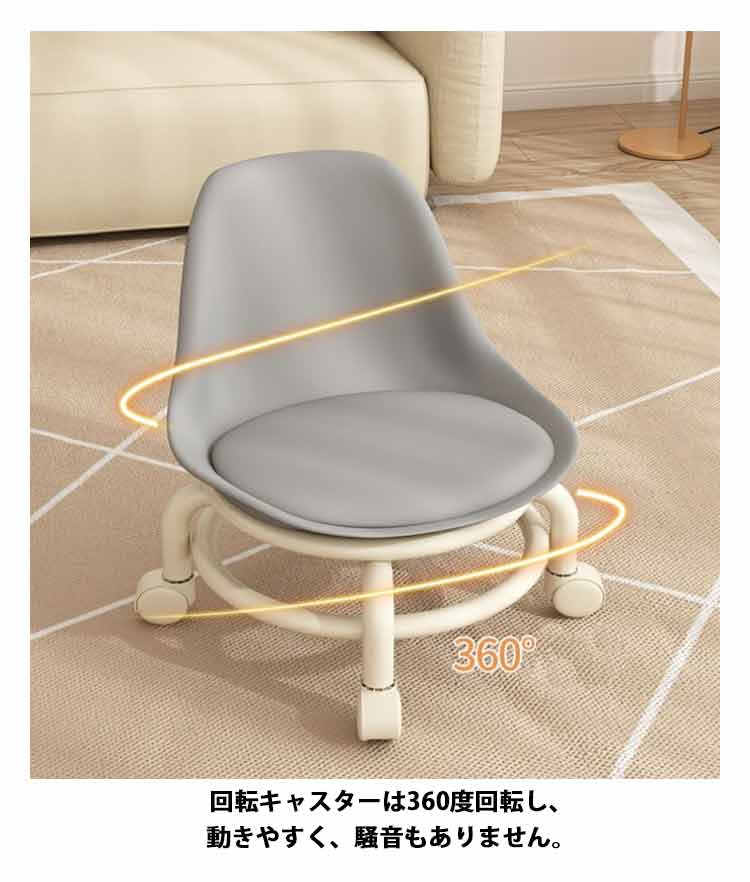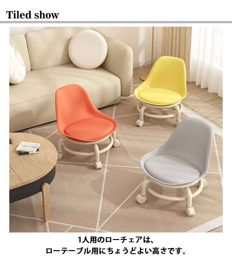 子供・大人問わずあらゆる方に喜んでいただけるローチェアです。回転キャスターは360度回転し、動きやすく、騒音もありません。厚みあるのクッション座面はPUレザーで水や汚れがサッと拭けます。高反発スポンジを使用しており、非常に柔らかく、座り心地が良いです背もたれ付きなので、テレビ鑑賞や本を読むときなどゆったりと過ごせそう1人用のローチェアは、ローテーブル用にちょうどよい高さです。