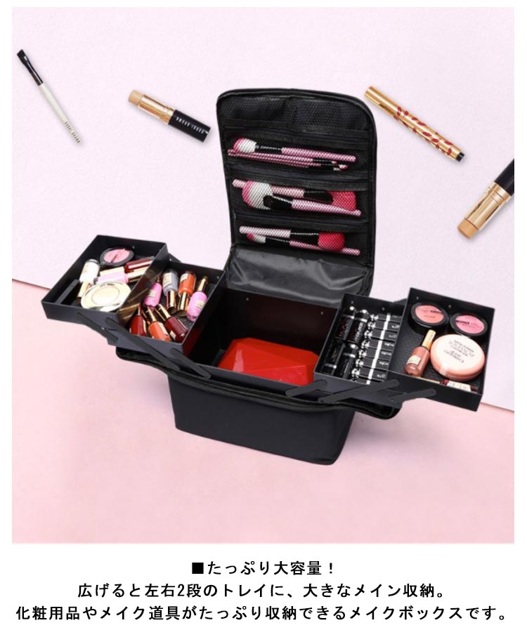 ■たっぷり大容量!広げると左右2段のトレイに、大きなメイン収納。化粧用品やメイク道具がたっぷり収納できるメイクボックスです。■便利な持ち手付き持ち運びにも役立つ持ち手付きのバニティポーチ。お出かけや旅行にもこれさえあれば、メークに困りません。■ギフトや贈り物にすっきり収まるコスメ収納は、女性・男性問わずにお喜びいただける整理グッズです。お友達の誕生日プレゼントや彼女へのクリスマス、バレンタイン、ホワイトデーのプレゼント、また兄弟・姉妹などご家族へのプチギフト、母の日、父の日、敬老の日など親しい方へのお祝いにオススメです。