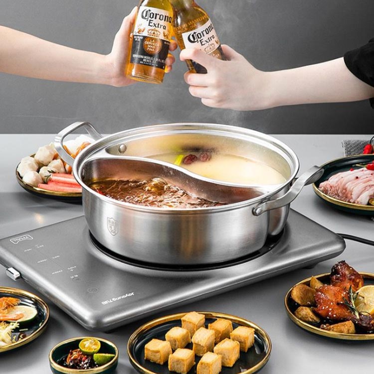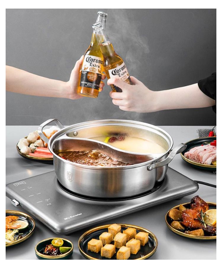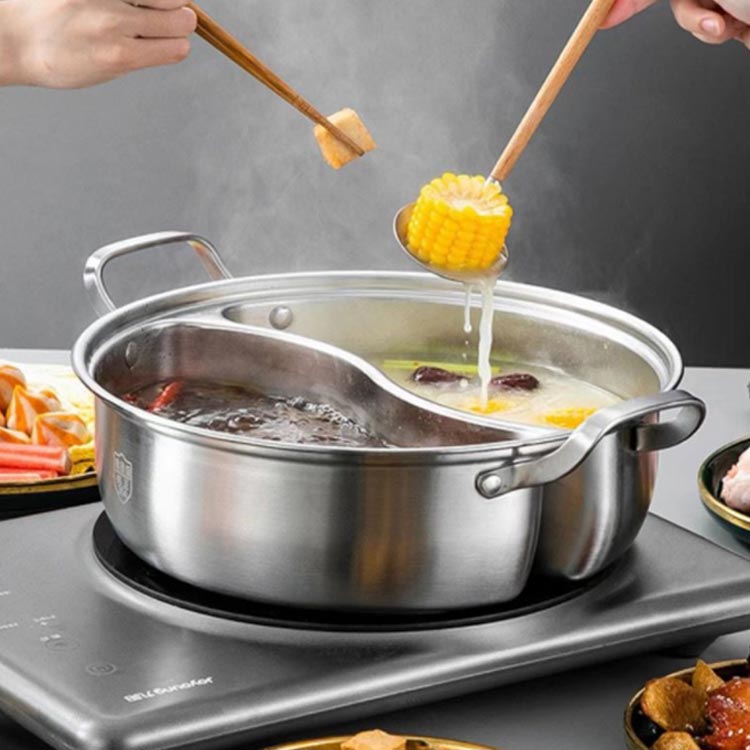 2味の料理が可能!火鍋用仕切り付き鍋が発売中。直径28cm/30cm/32cmの3サイズ展開、ガス火もIHも両方OK!大人向けの味と子供が喜ぶ味にも分けたり、和風と中華に分けたり、ジャンルや味を二つ用意できます!カレーの甘口と辛口をそれぞれ一緒に作れたり、すき焼きとしゃぶしゃぶを同時に!なんて贅沢なこともできちゃいます!ステンレス製でお手入れ簡単!キッチンでも食卓でも活躍します。
