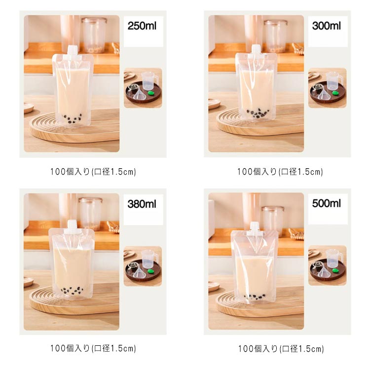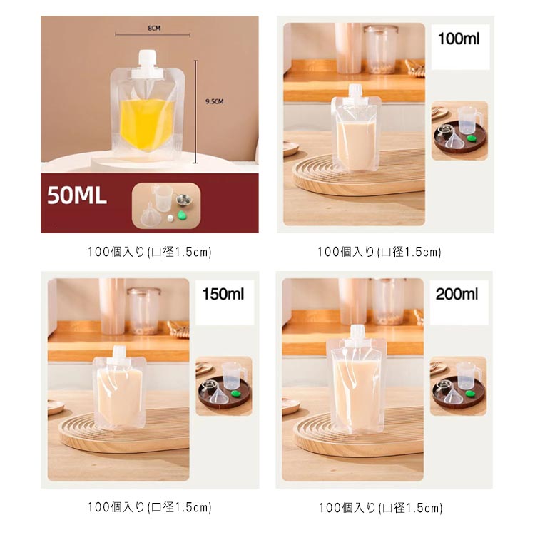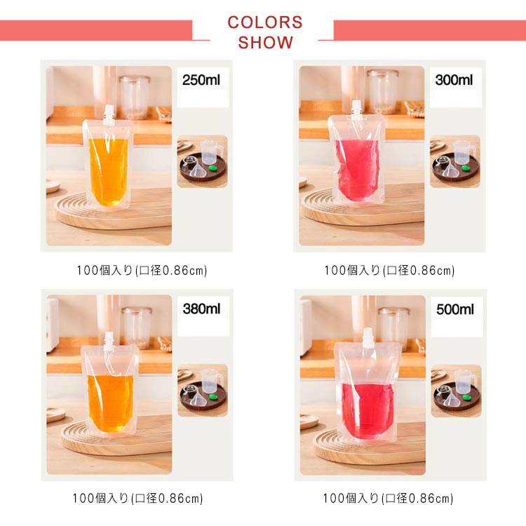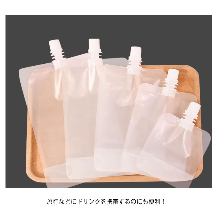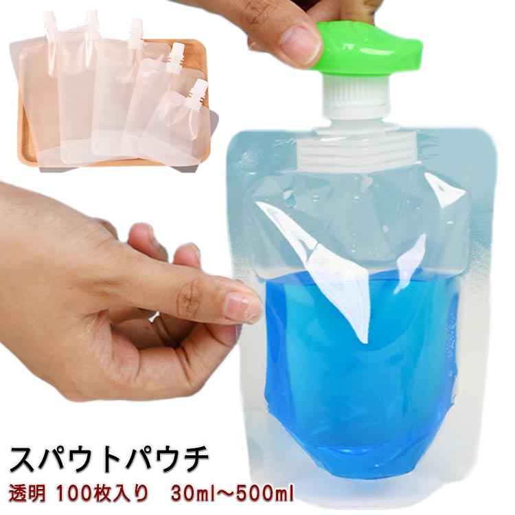 100個入り スパウトパウチ 透明 30ml 50ml 100ml 150ml 200ml 250ml 300ml 380ml 500ml 規格袋 パウチ ふた付 スタンド袋 ドリンクパック 飲み物用 ジュースパック 液体容器 注ぎ口付きパック 詰め替え 保存容器 調味料容器 自立式 耐高温 冷凍 キャップ付 送料無料