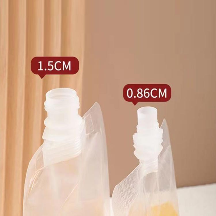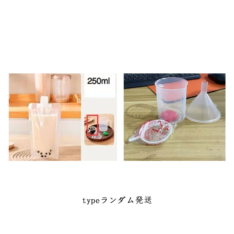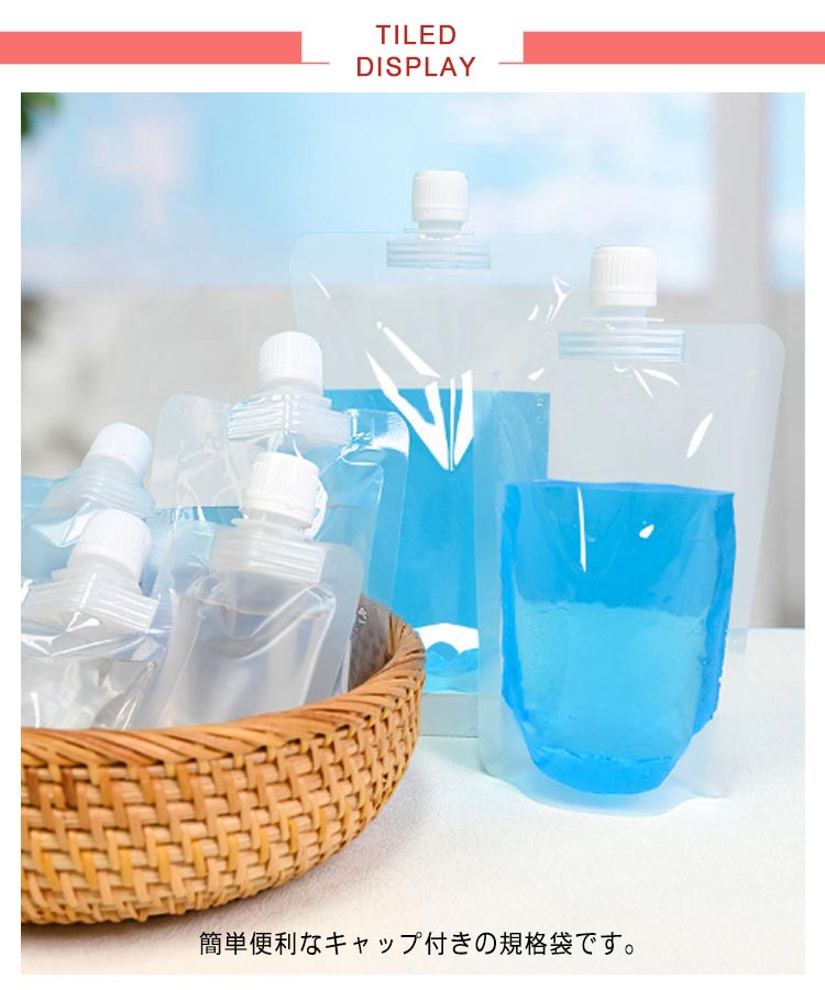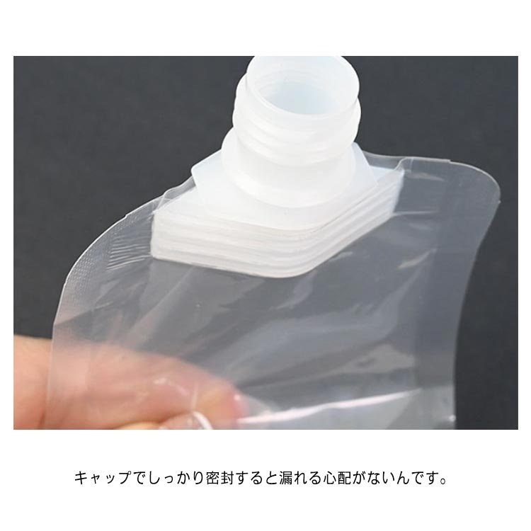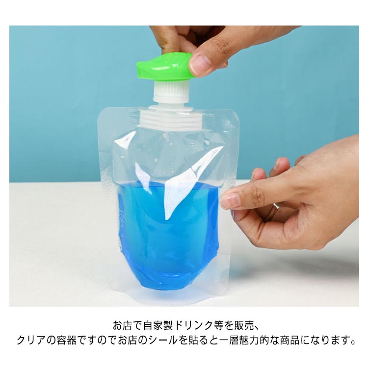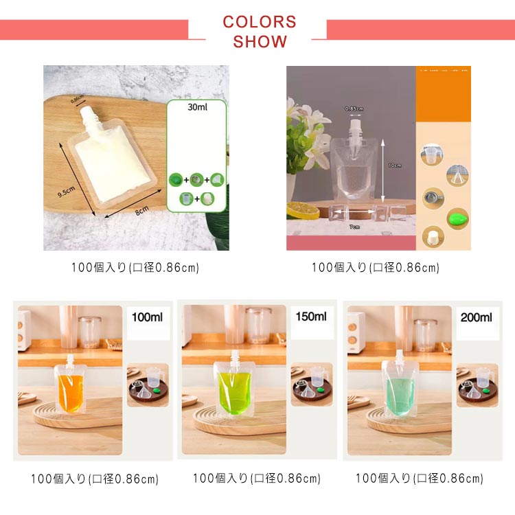 | スパウトパウチ 透明 100枚入り 30ml~500ml 瓶やプラスチック容器よりもっと手軽に! 簡単便利なキャップ付きの規格袋です。 温&冷OK!沸騰した100度のお湯で湯煎できます。 冷凍庫保存ok!-20度にも耐えれます。 お店で自家製ドリンク等を販売、クリアの容器ですのでお店のシールを貼ると一層魅力的な商品になります。 キャップでしっかり密封すると漏れる心配がないんです。 旅行などにドリンクを携帯するのにも便利! | |