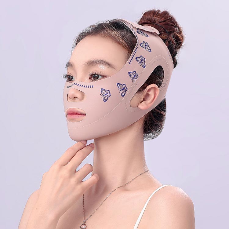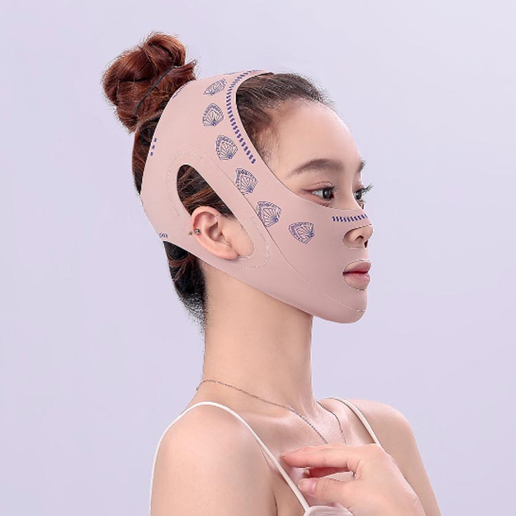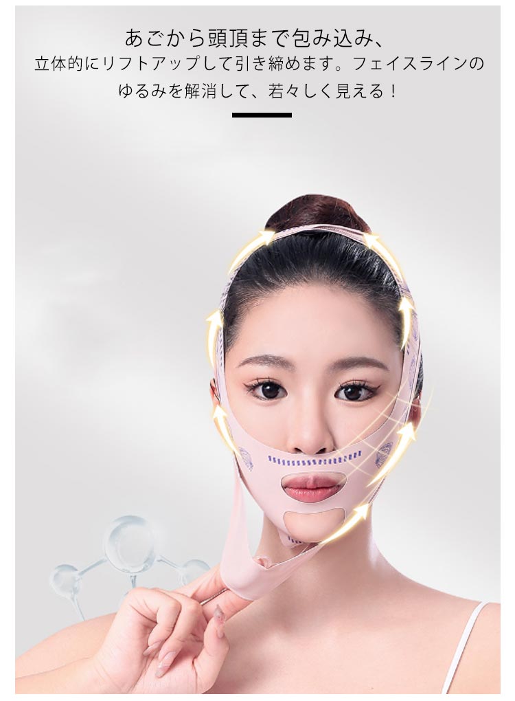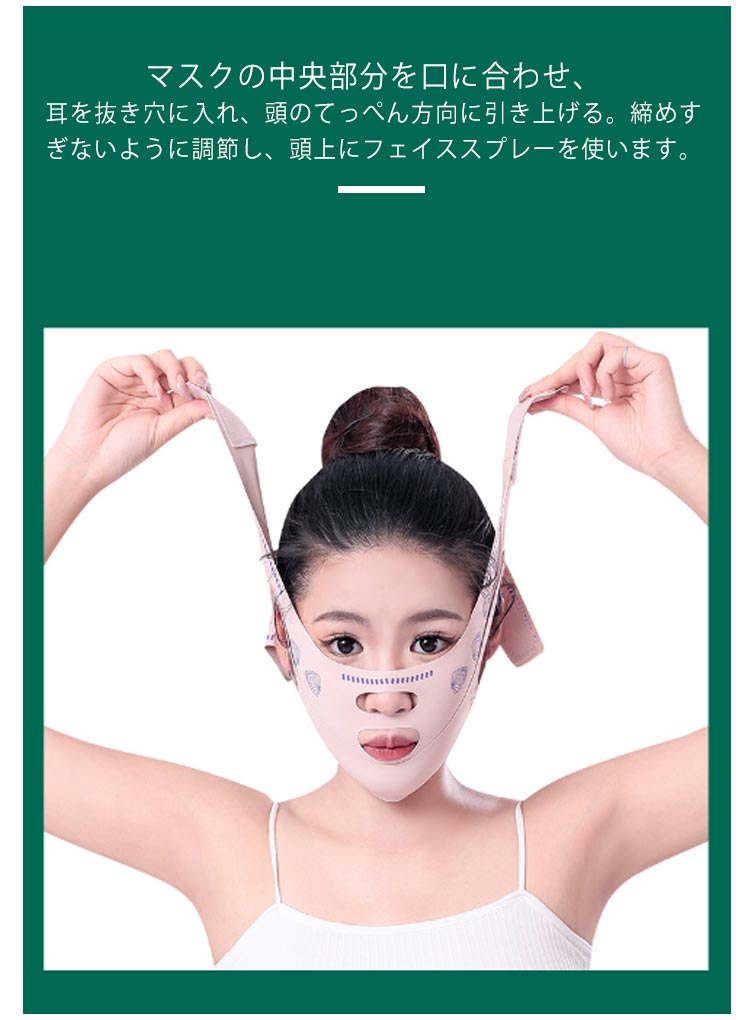 二重アゴ、むくみを解消!フェイスラインスッキリ!自宅で手軽に顔やせエステ!高い弾力性をもつ特殊な生地を使用し、顔全体の気になる部分を一気に持ちあげ、強力なリフトアップ!あごから頭頂まで包み込み、立体的にリフトアップして引き締めます。フェイスラインのゆるみを解消して、若々しく見える!マスクの中央部分を口に合わせ、耳を抜き穴に入れ、頭のてっぺん方向に引き上げる。締めすぎないように調節し、頭上にフェイススプレーを使います。フィット感があるので顔のラインに密着して快適。就寝時、料理時、掃除時、家事時、育児時、読書時、入浴時などリラックスしながら、気軽に顔マッサージができます。