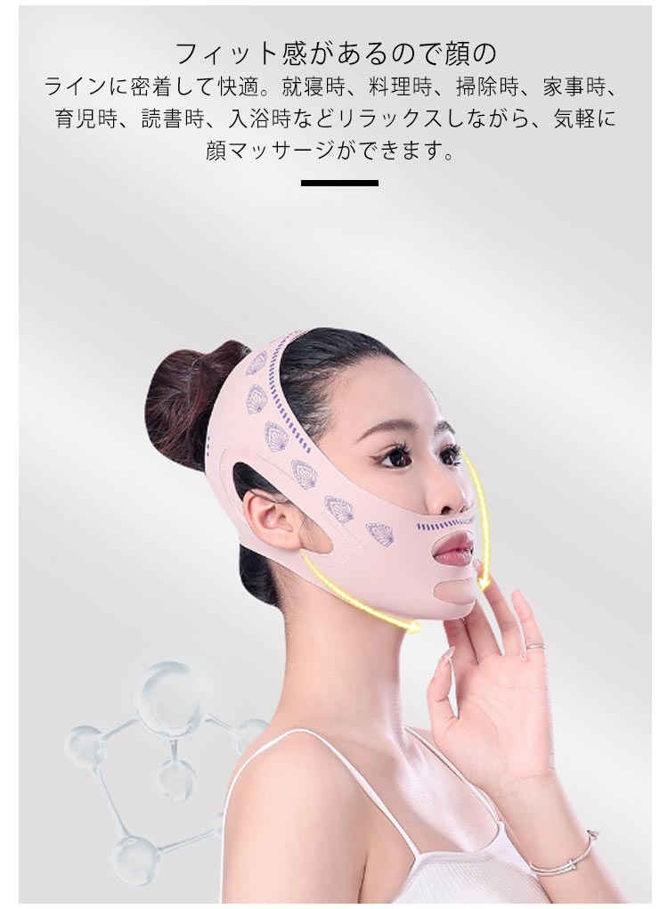 | 二重アゴ、むくみを解消!フェイスラインスッキリ!自宅で手軽に顔やせエステ! 高い弾力性をもつ特殊な生地を使用し、顔全体の気になる部分を一気に持ちあげ、強力なリフトアップ! あごから頭頂まで包み込み、立体的にリフトアップして引き締めます。フェイスラインのゆるみを解消して、若々しく見える! マスクの中央部分を口に合わせ、耳を抜き穴に入れ、頭のてっぺん方向に引き上げる。締めすぎないように調節し、頭上にフェイススプレーを使います。 フィット感があるので顔のラインに密着して快適。就寝時、料理時、掃除時、家事時、育児時、読書時、入浴時などリラックスしながら、気軽に顔マッサージができます。 | |
