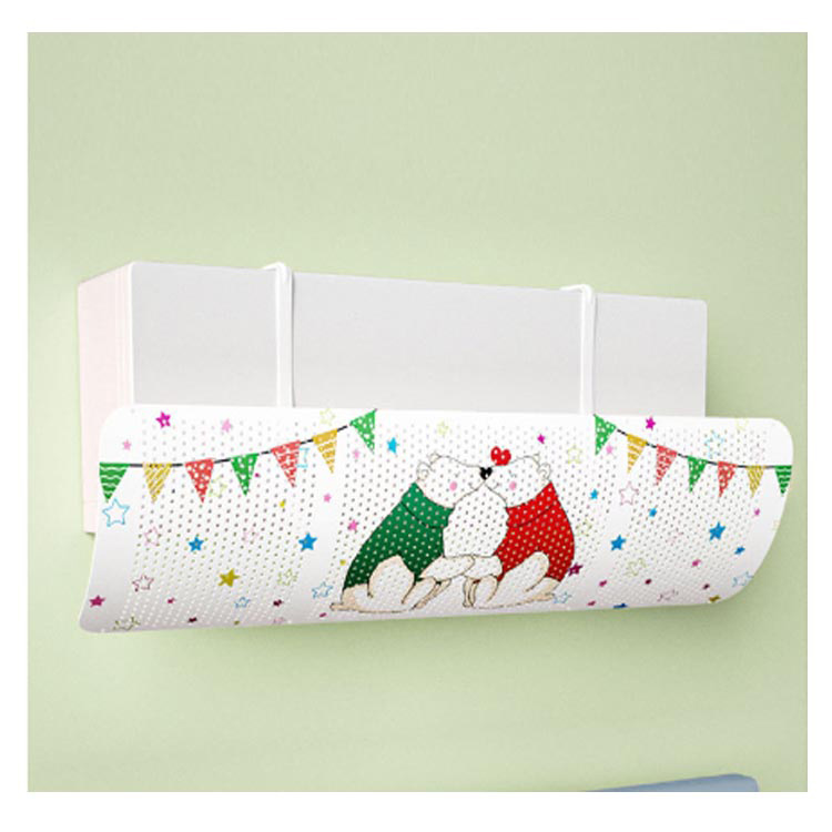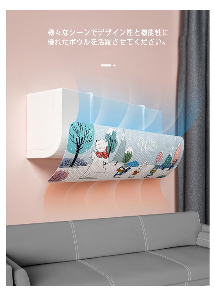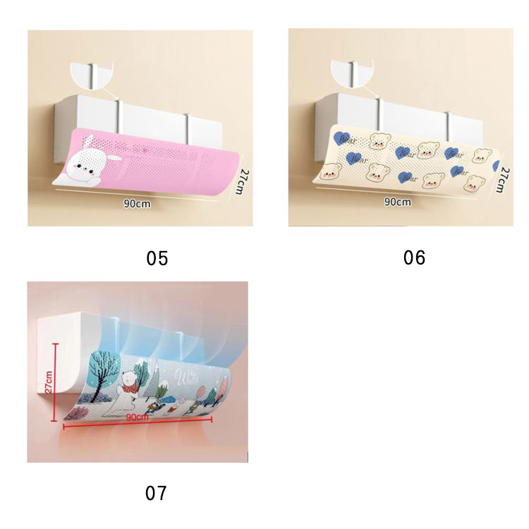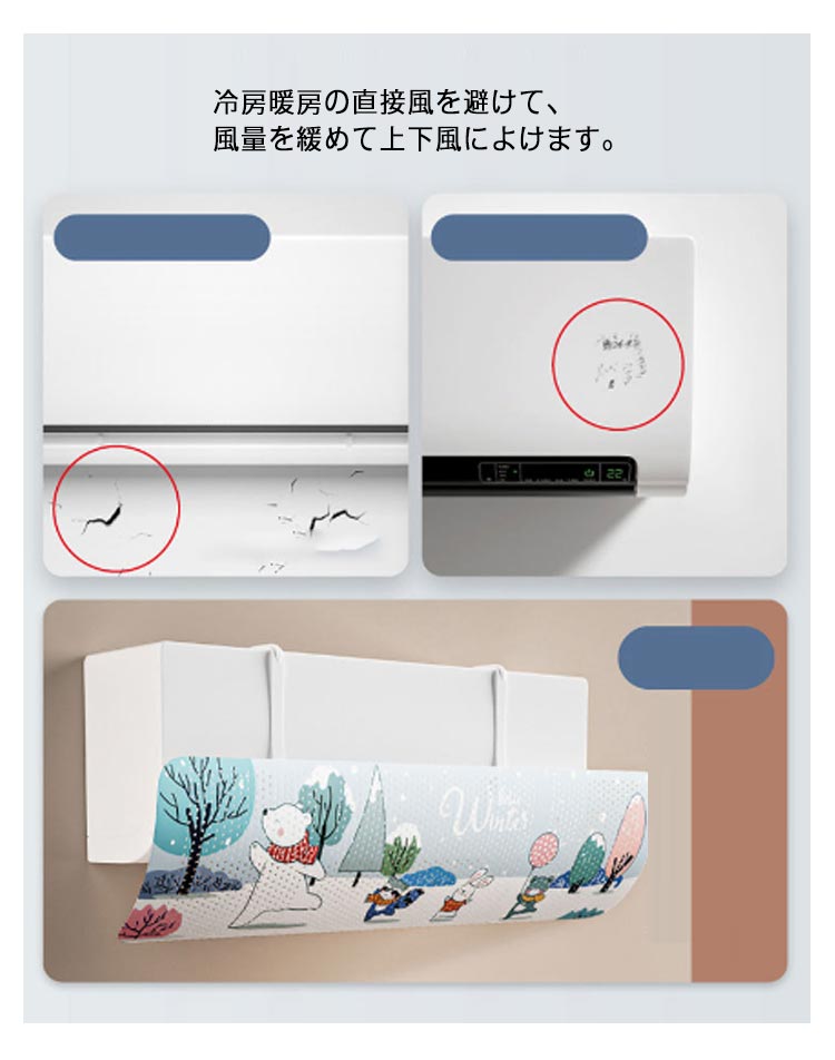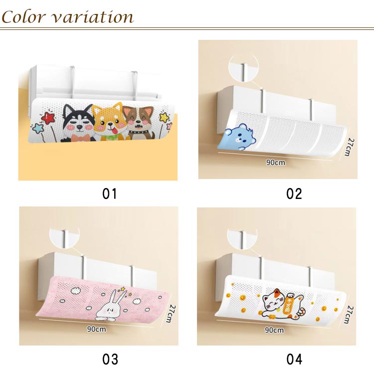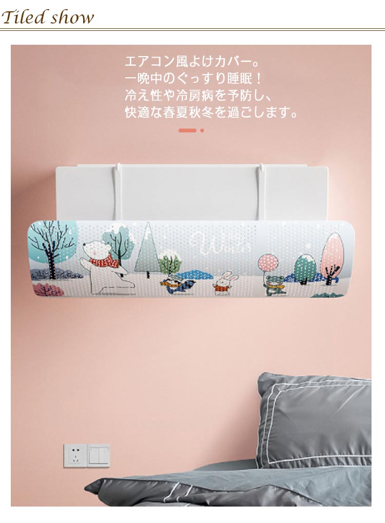 可愛い動物柄エアコン風よけカバー。家庭用の99.9%のエアコンに適用。エアコン風よけカバー。一晩中のぐっすり睡眠!や冷房病を予防し、快適な春夏秋冬を過ごします。冷房暖房の直接風を避けて、風量を緩めて上下風によけます。掛けるだけで使用可能!機器や壁に傷をつけにくく、簡単に取り付けできます。プレートの表面に小さな通気孔を施し、風圧を緩めます。使用場所や気温の変化に応じて、風除け板の角度を調整できます。工事不要で取り付け簡単。釘とかを使わずに壁に傷つけずに済むのです。1.両側のサポートフレームを予め 設けられた穴に差し込みます。2.中央のサポートフレームを予め 設けられた穴に差し込みます。3.透明な支柱をエアコンに差し込みます。4.取り付けが完了しました。使わないときはくるくると丸めてコンパクトに収納可能。