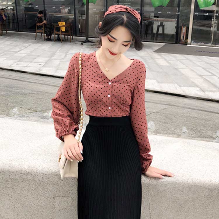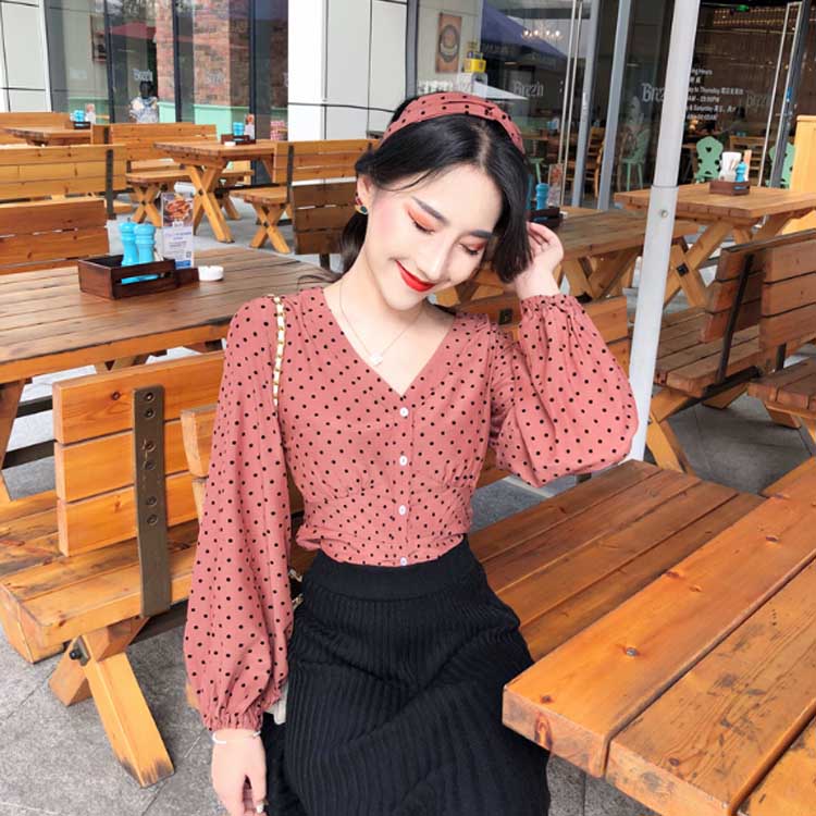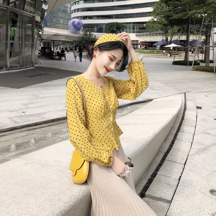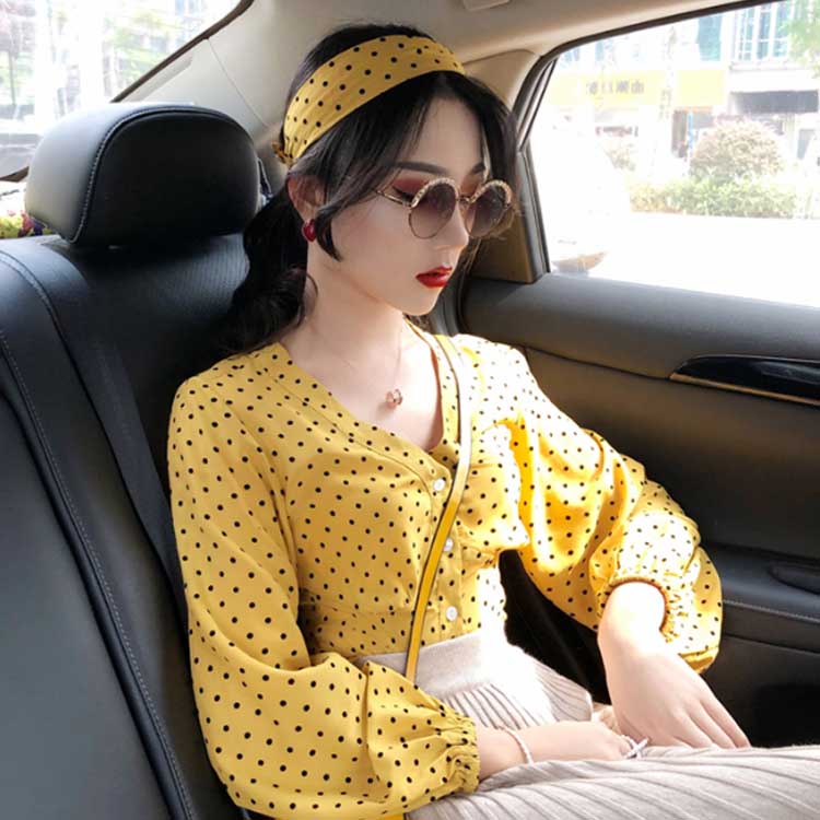 [2色]ブラウス スカーフ付きブラウス シャツ レディース ドット ボタン トップス Vネック キャンディスリーブ ボリュームスリーブ ボリューム袖 長袖 女子