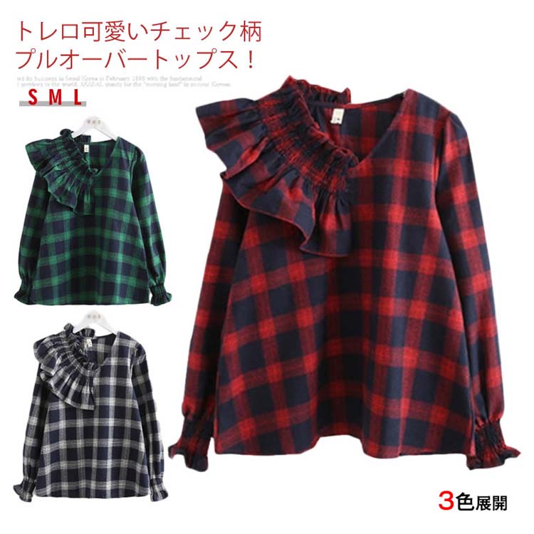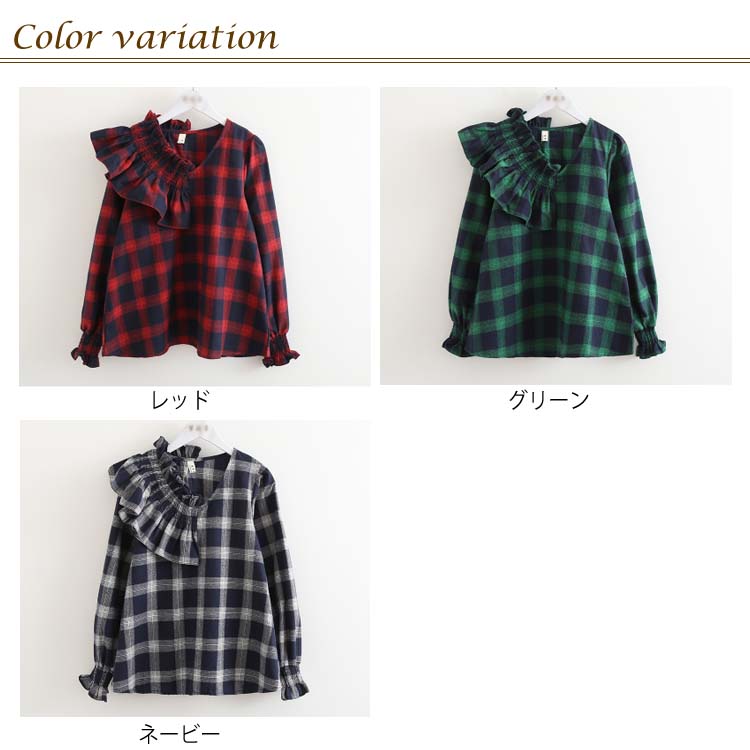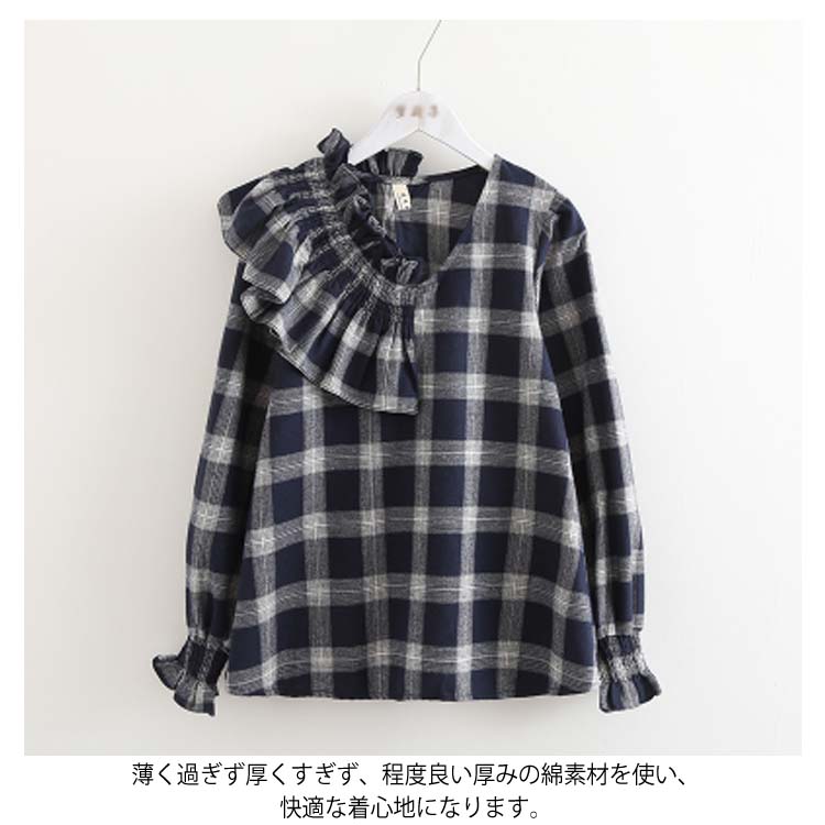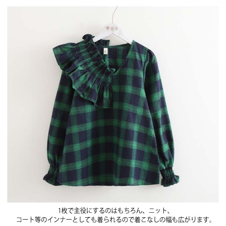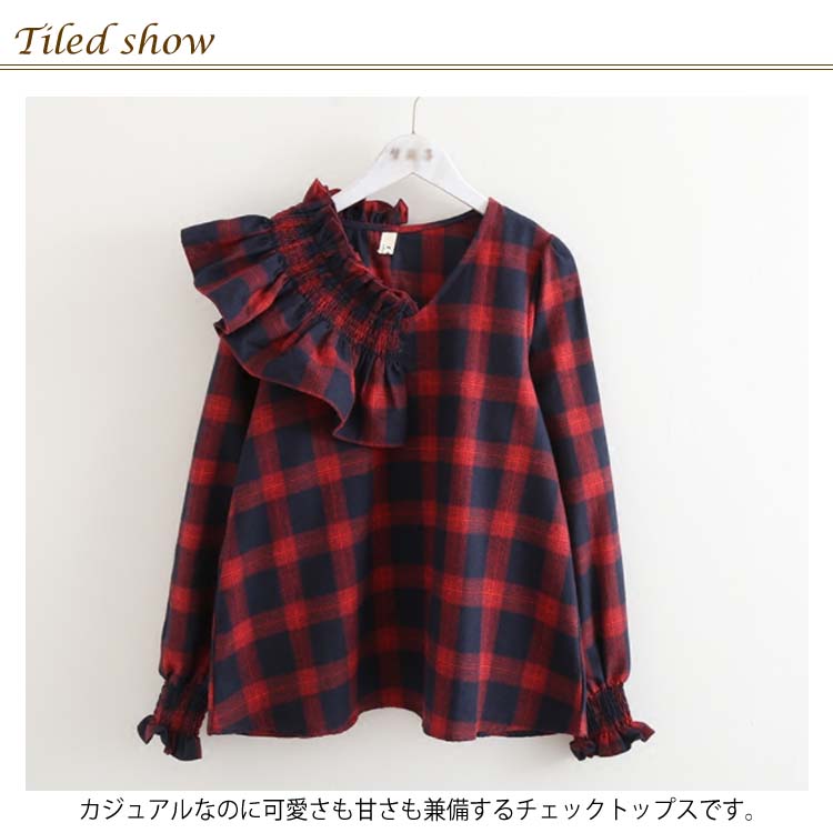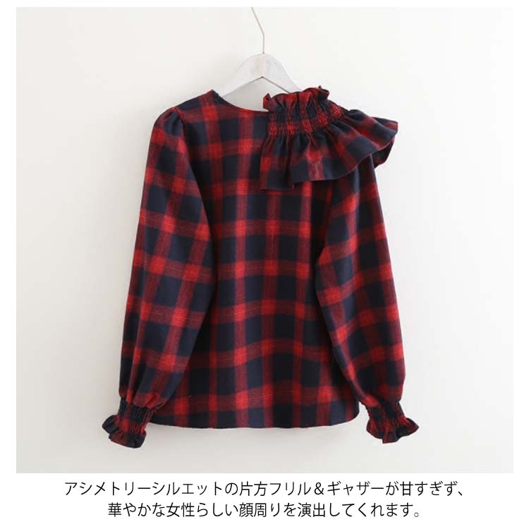 ボリュームのある片方フリルがお洒落抜群!肩フリル シャツ ブラウス チェック柄トップス プルオーバー トップス フリル アシメトリー バルーンスリーブ ロングスリーブ トレロ 可愛い