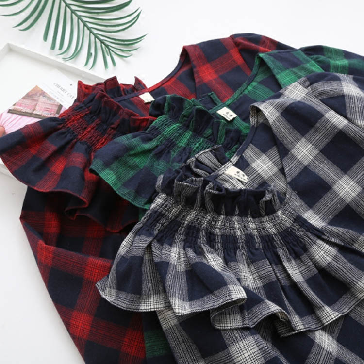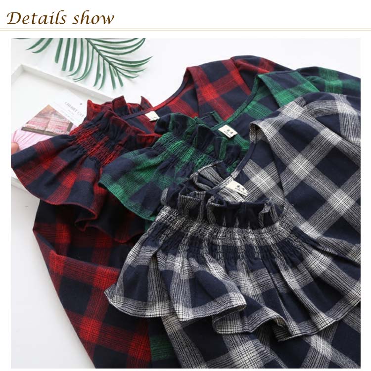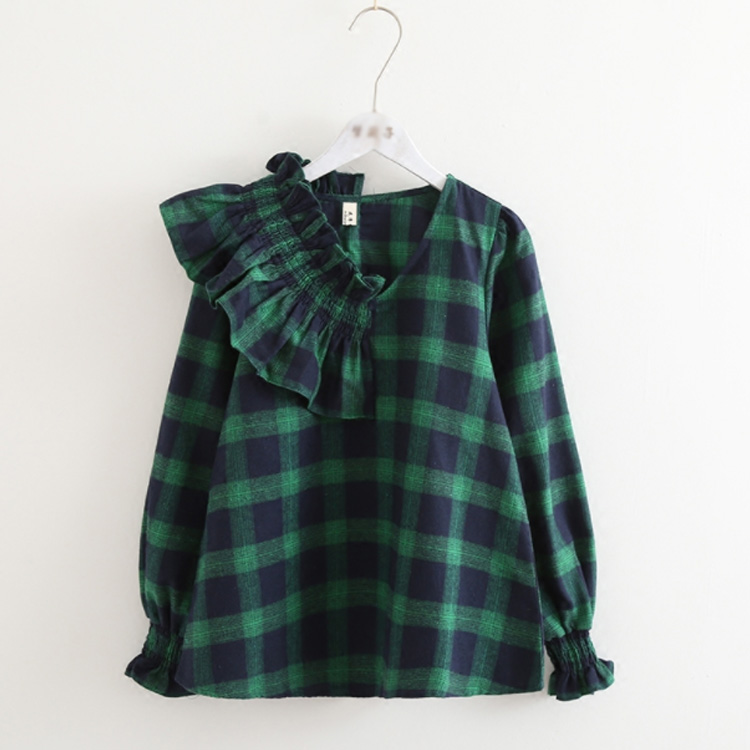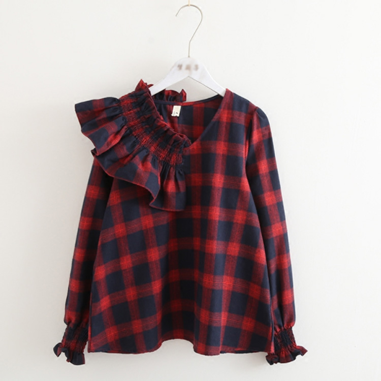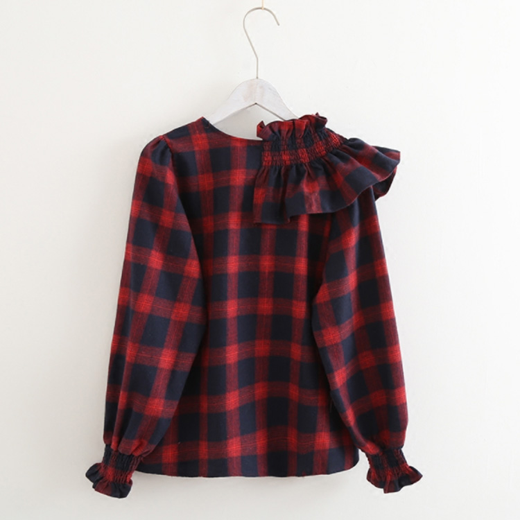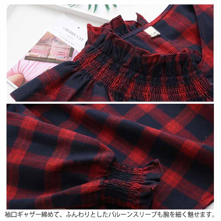 ボリュームのある片方フリルがお洒落抜群!肩フリル シャツ ブラウス チェック柄トップス プルオーバー トップス フリル アシメトリー バルーンスリーブ ロングスリーブ トレロ 可愛い
