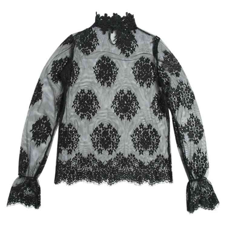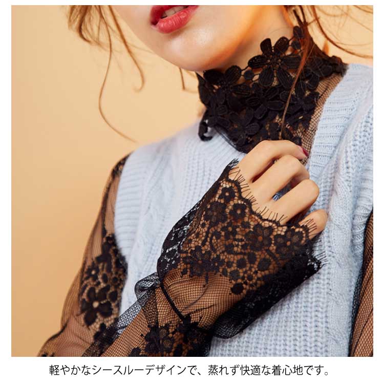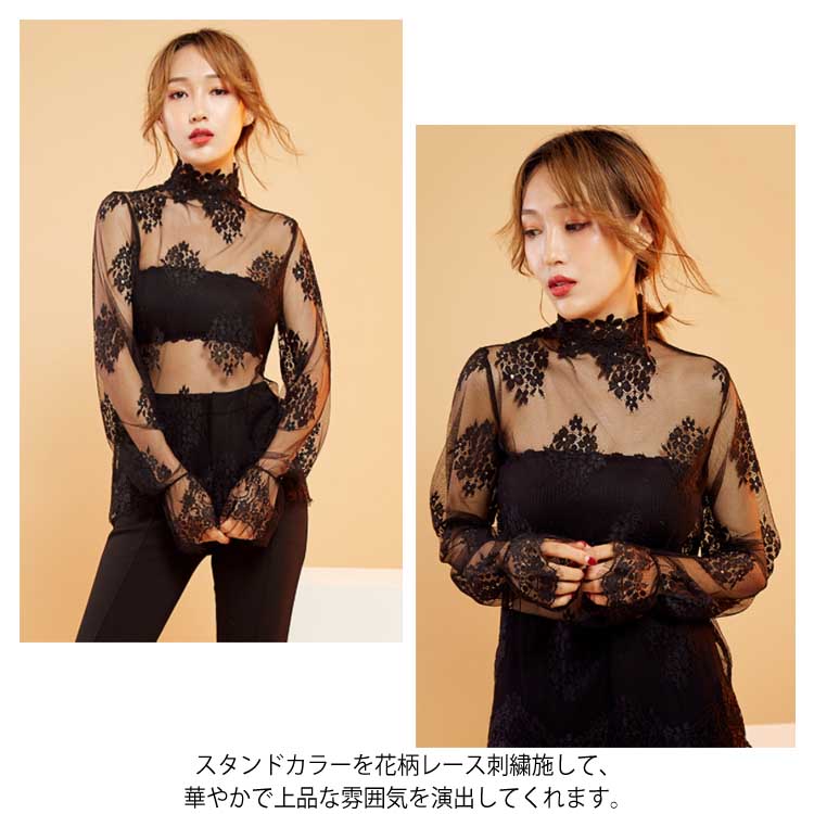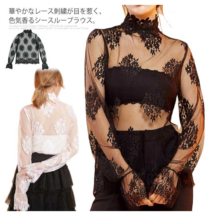 華やかで上品なレース刺繍item。ブラウス トップス レース 刺繍入り シースルートップス シースルー スタンドカラー 花柄ブラウス 透け感 セクシー 女性 ロングスリーブ 薄手 春 夏