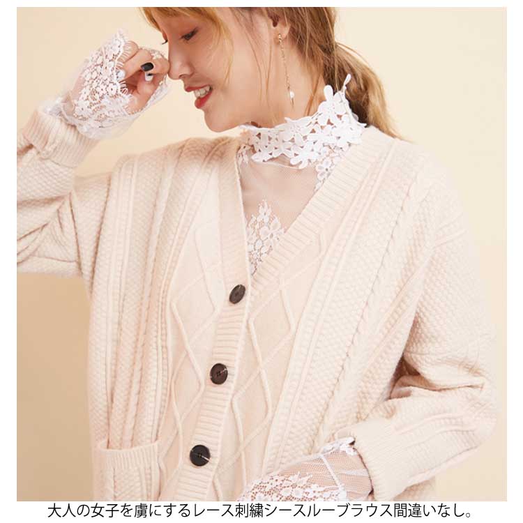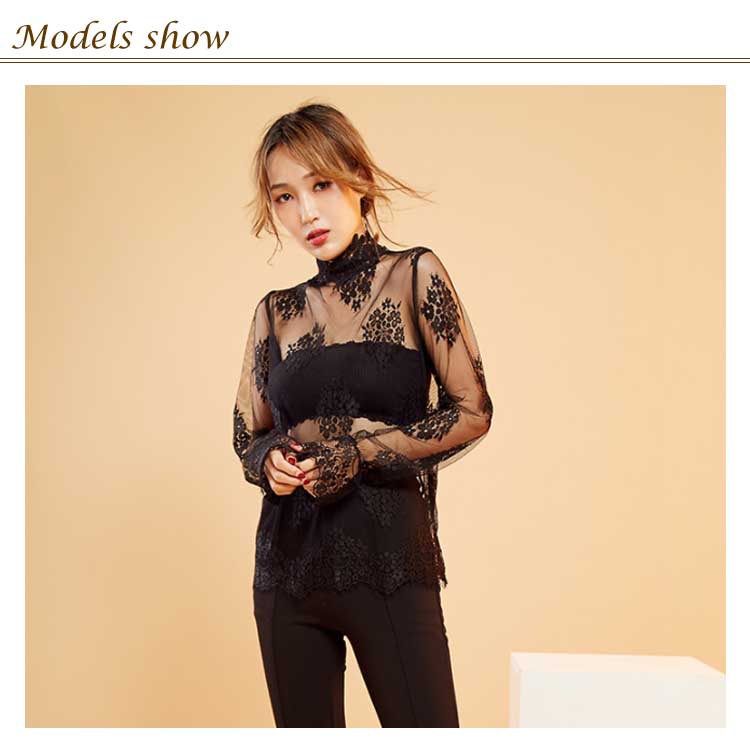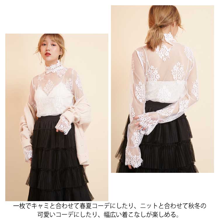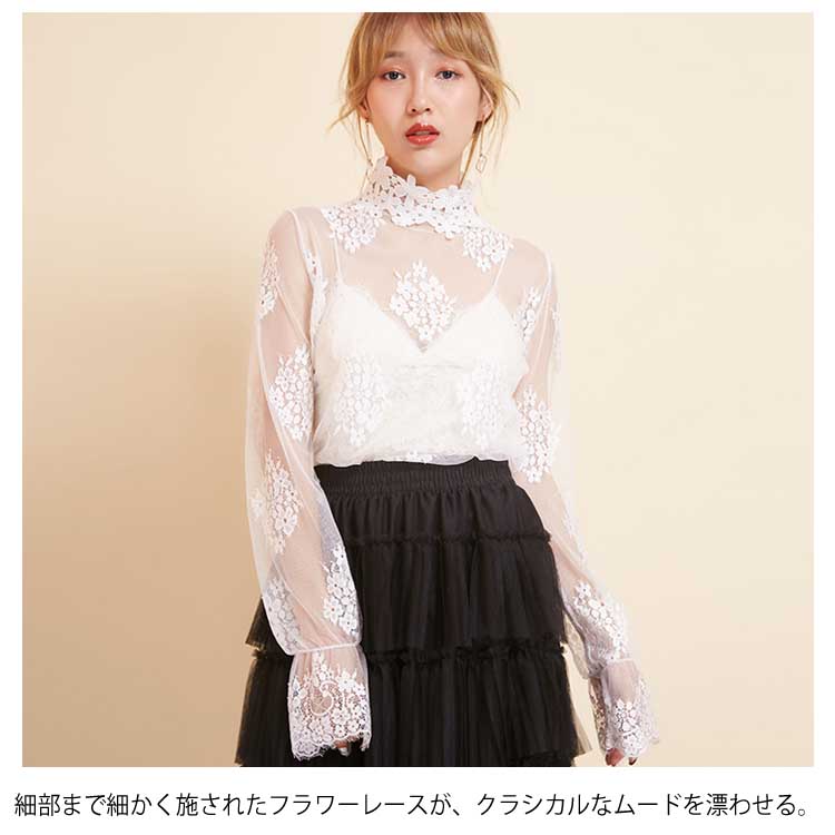 | 華やかなレース刺繍が目を惹く、色気香るシースルーブラウス。 細部まで細かく施されたフラワーレースが、クラシカルなムードを漂わせる。 軽やかなシースルーデザインで、蒸れず快適な着心地です。 スタンドカラーを花柄レース刺繍施して、華やかで上品な雰囲気を演出してくれます。 一枚でキャミと合わせて春夏コーデにしたり、ニットと合わせて秋冬の可愛いコーデにしたり、幅広い着こなしが楽しめる。 大人の女子を虜にするレース刺繍シースルーブラウス間違いなし。 | |