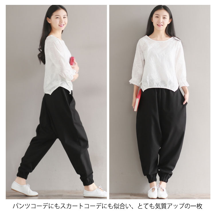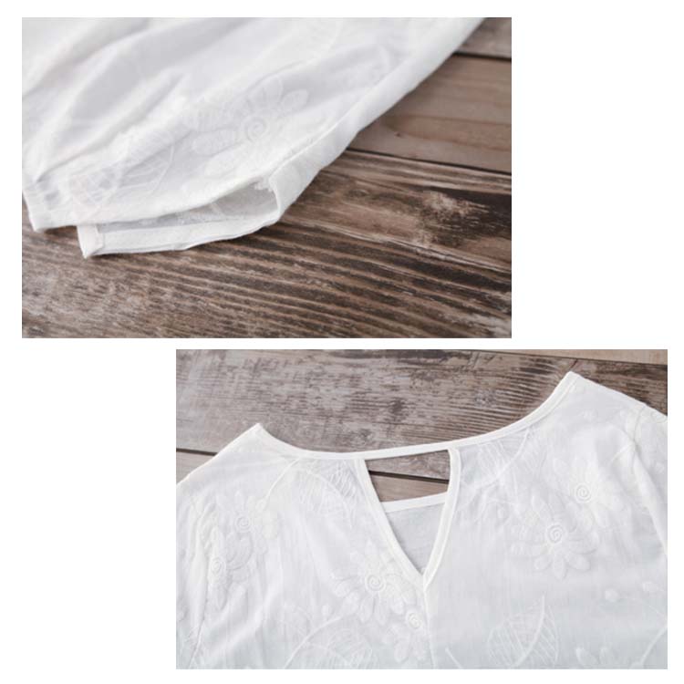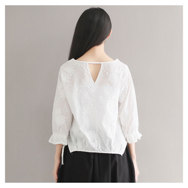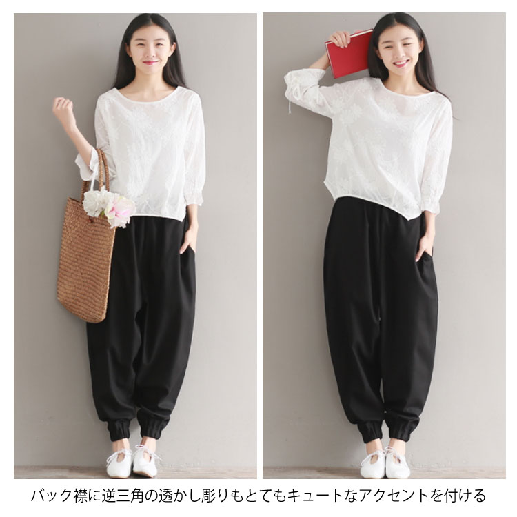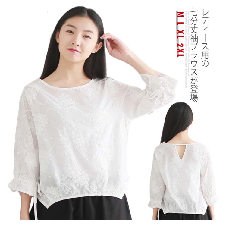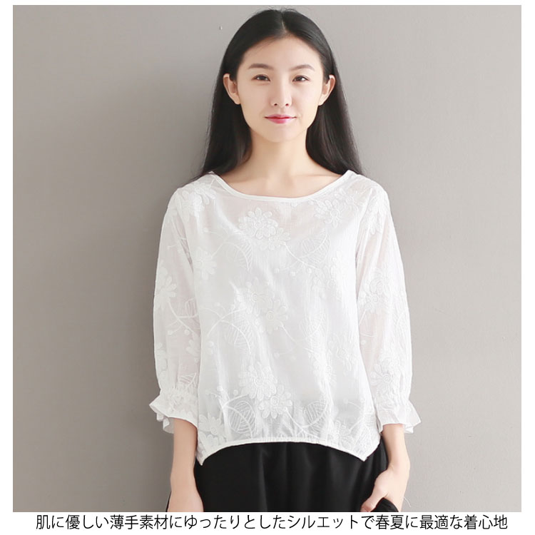 | レディース用の七分丈袖ブラウスが登場 肌に優しい薄手素材にゆったりとしたシルエットで春夏に最適な着心地 清潔感たっぷりの色合いにレトロな花柄刺繍デザインはオシャレな森ガール風ファッションを演出 バック襟に逆三角の透かし彫りもとてもキュートなアクセントを付ける パンツコーデにもスカートコーデにも似合い、とても気質アップの一枚 | |