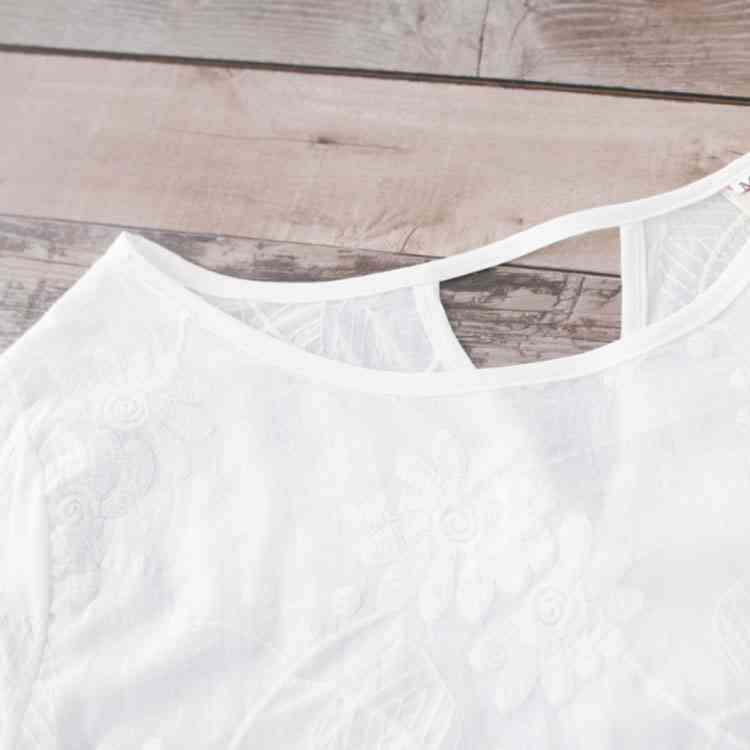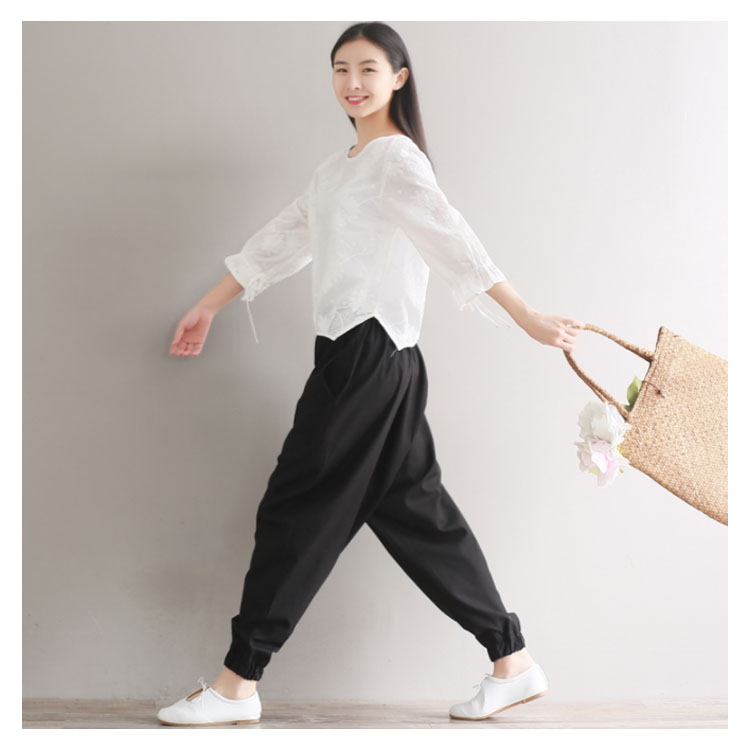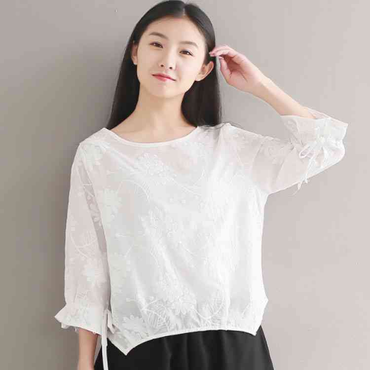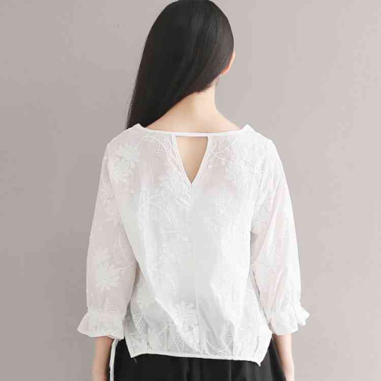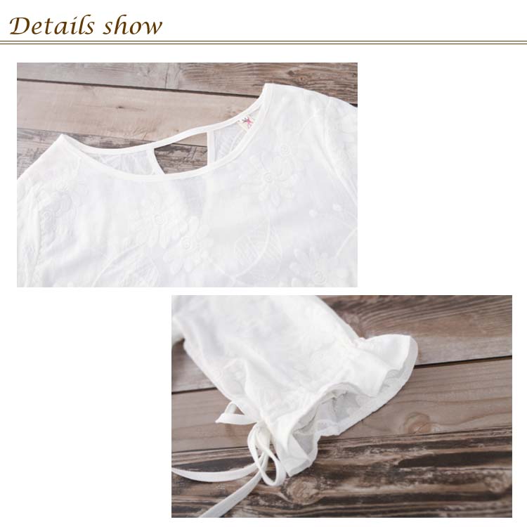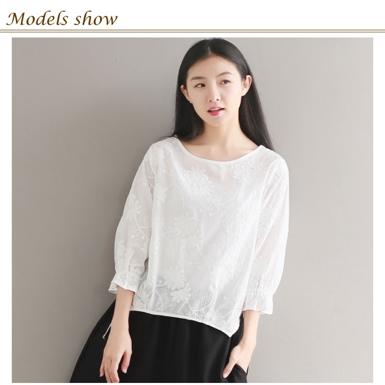 | レディース用の七分丈袖ブラウスが登場 肌に優しい薄手素材にゆったりとしたシルエットで春夏に最適な着心地 清潔感たっぷりの色合いにレトロな花柄刺繍デザインはオシャレな森ガール風ファッションを演出 バック襟に逆三角の透かし彫りもとてもキュートなアクセントを付ける パンツコーデにもスカートコーデにも似合い、とても気質アップの一枚 | |