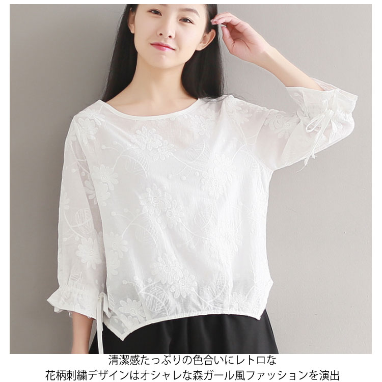 刺繍ブラウス 七分丈袖 レディース ブラウス 森ガール 花柄 刺繍 シャツ ゆったり レトロ 女性用 トップス 七分丈袖Tシャツ エスニック風