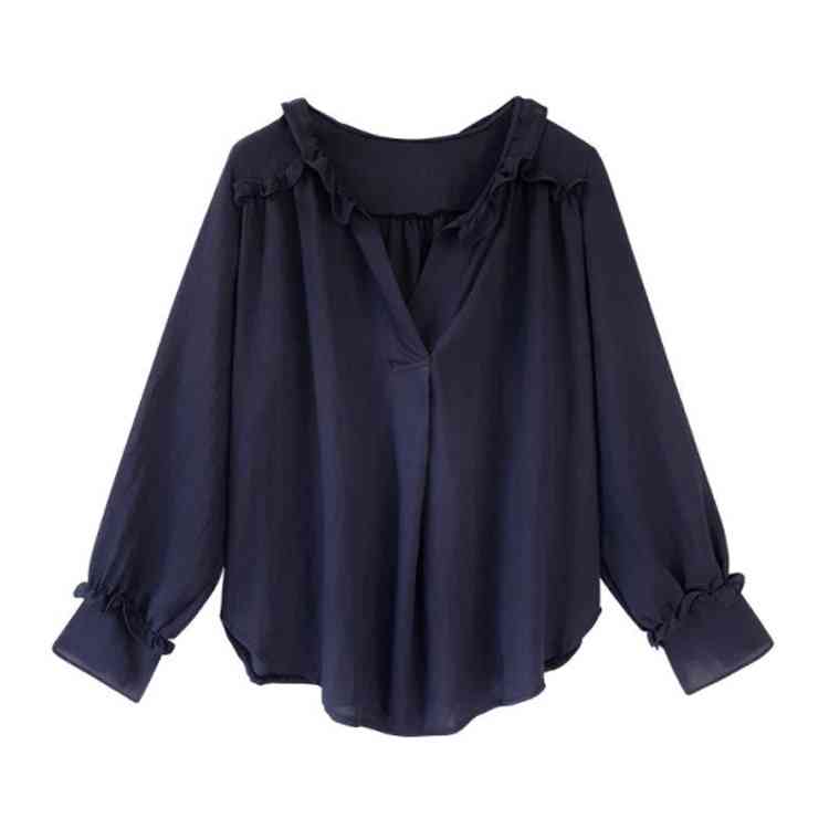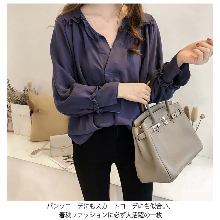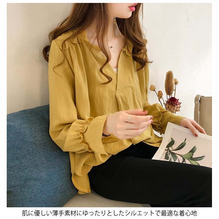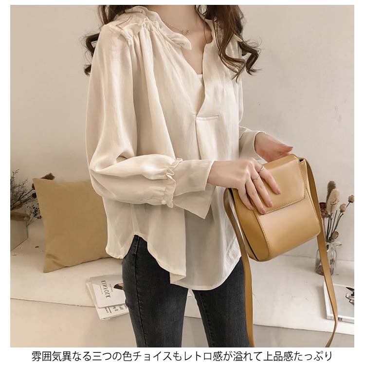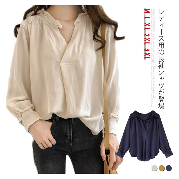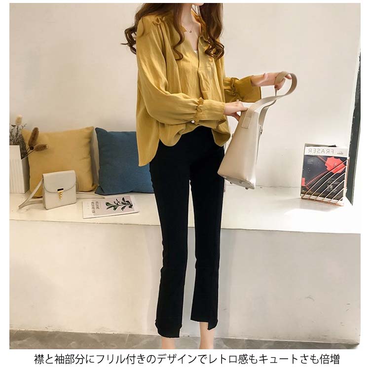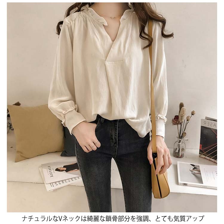 ブラウス レディース シャツ 長袖 ゆったり フリルブラウス レトロ 女性用 トップス 長袖ブラウス Vネック オシャレ キュート