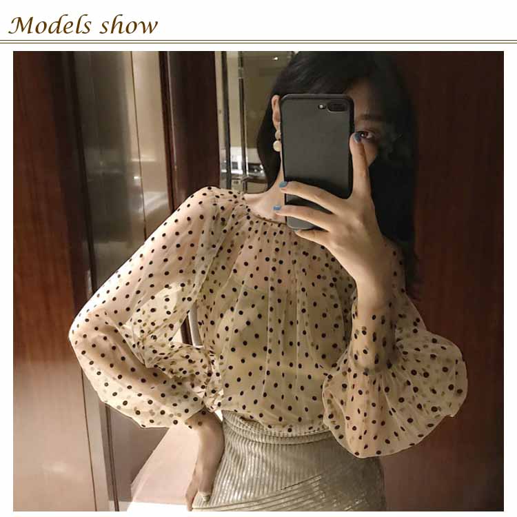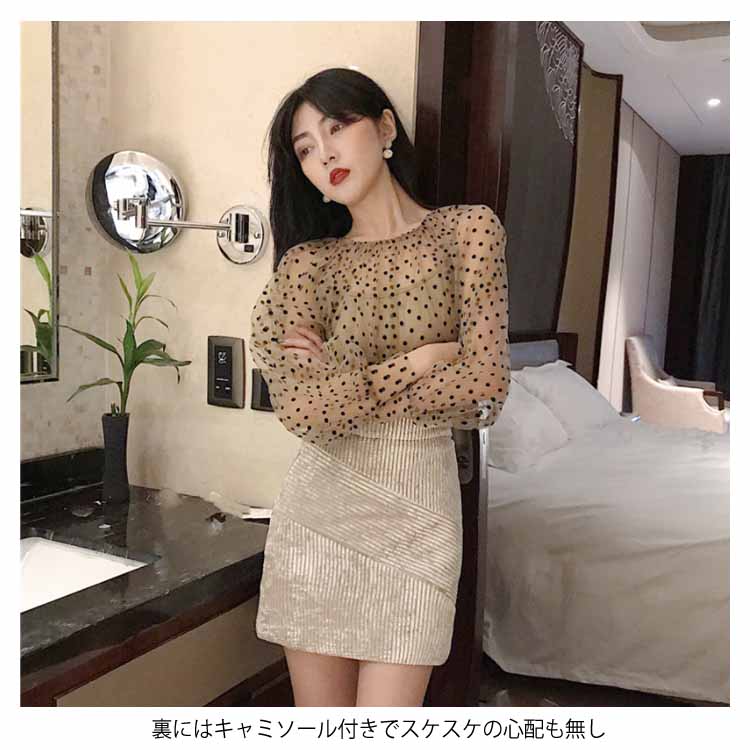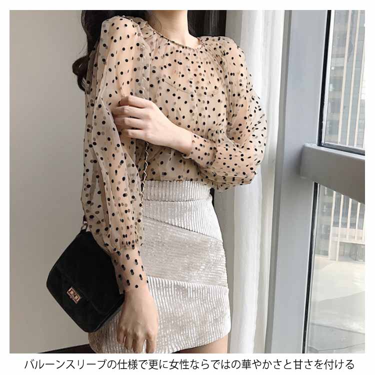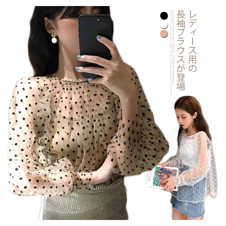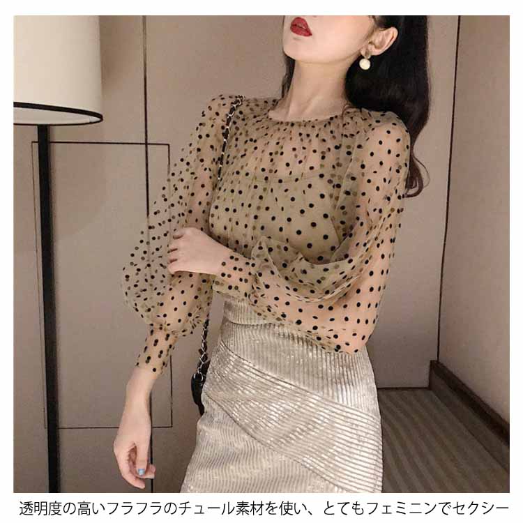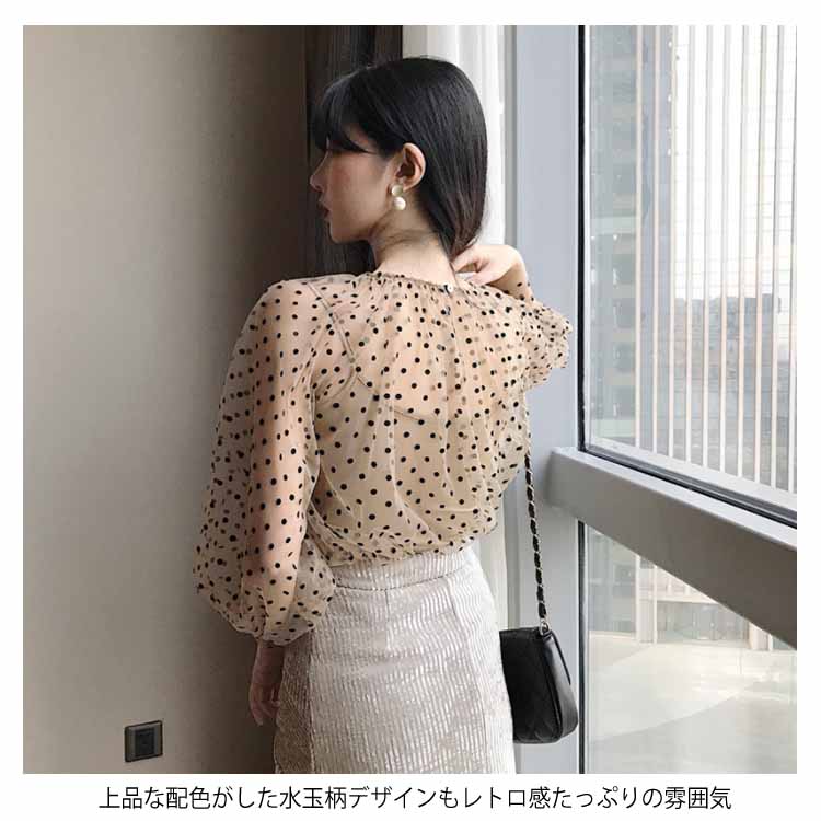 チュールブラウス 水玉柄 レディース ブラウス 透明 キャミソール 2点セット バルーンスリーブ 女性用 長袖シャツ ドット柄 レトロ フェミニン