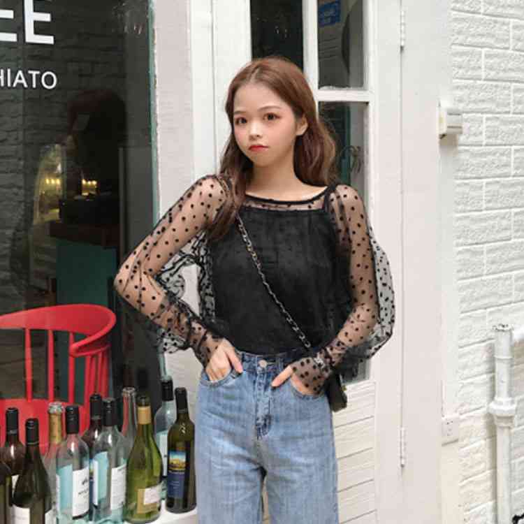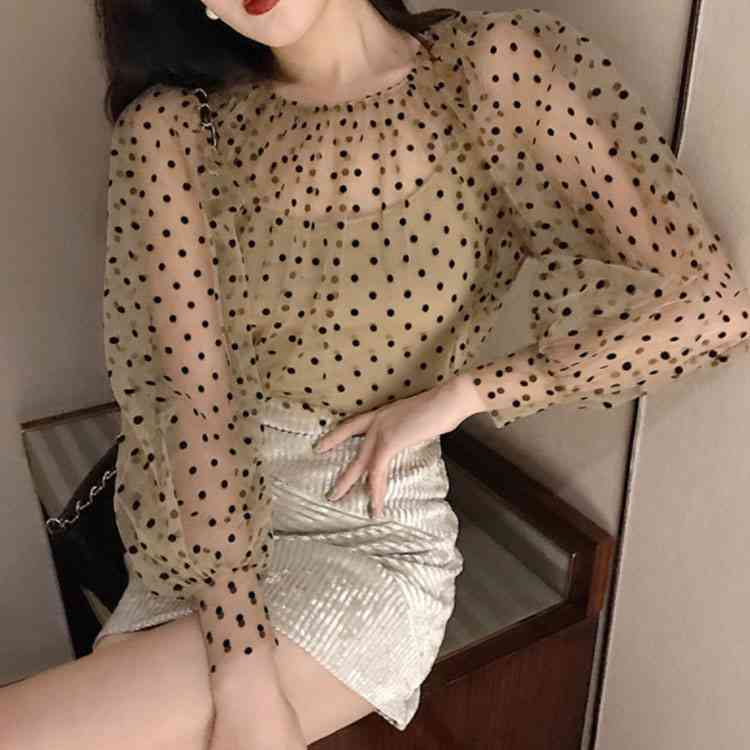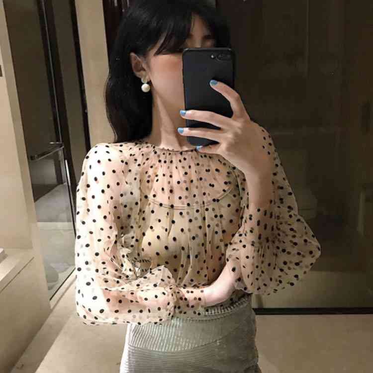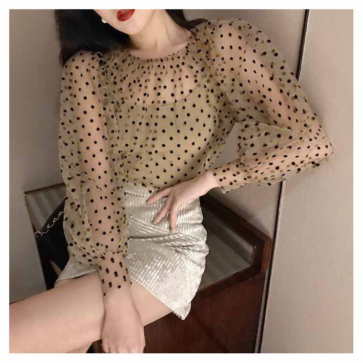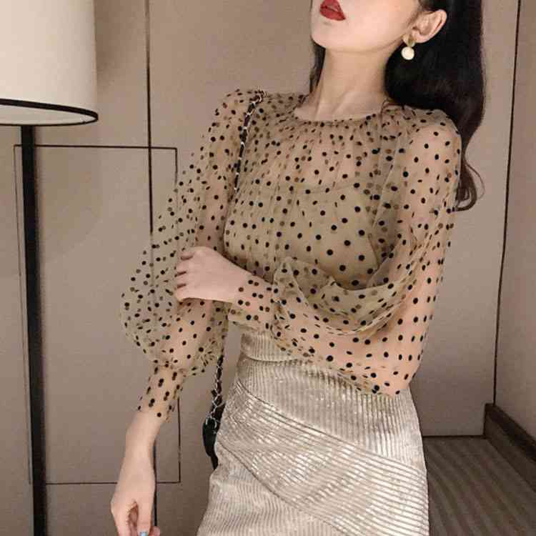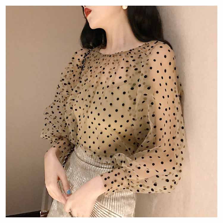 チュールブラウス 水玉柄 レディース ブラウス 透明 キャミソール 2点セット バルーンスリーブ 女性用 長袖シャツ ドット柄 レトロ フェミニン