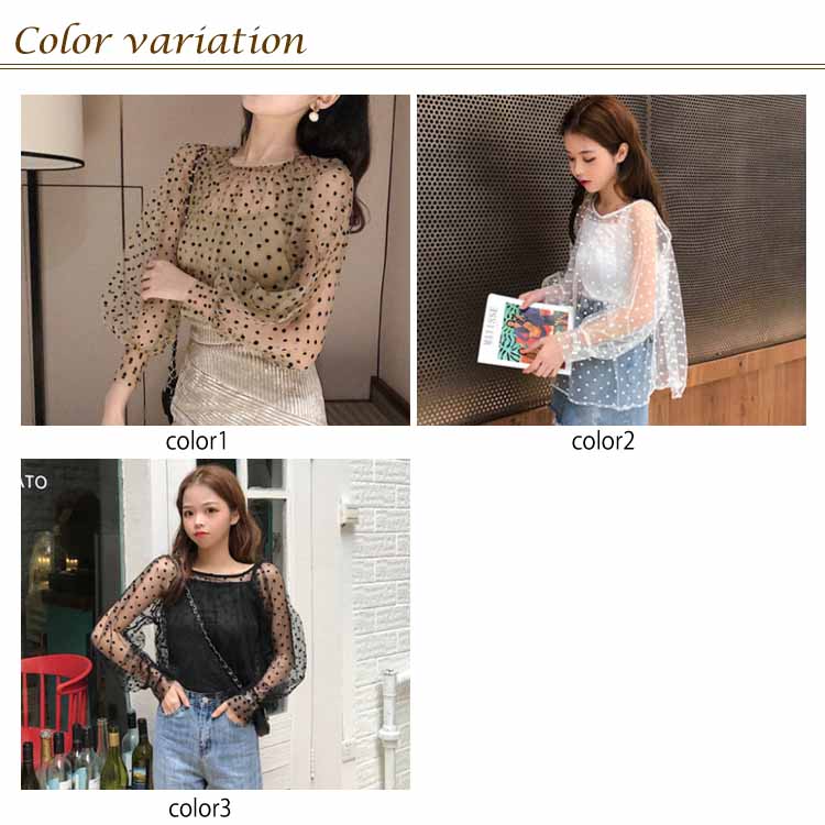 | レディース用の長袖ブラウスが登場 透明度の高いフラフラのチュール素材を使い、とてもフェミニンでセクシー 裏にはキャミソール付きでスケスケの心配も無し バルーンスリーブの仕様で更に女性ならではの華やかさと甘さを付ける 上品な配色がした水玉柄デザインもレトロ感たっぷりの雰囲気 スカートコーデにもパンツコーデにも似合い、とても気質アップのワンセット | |
