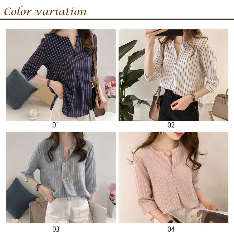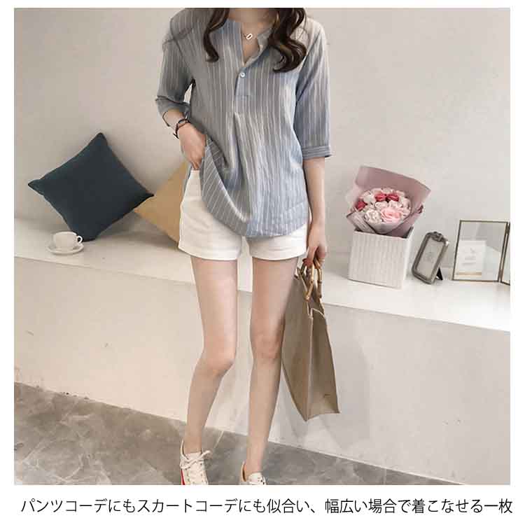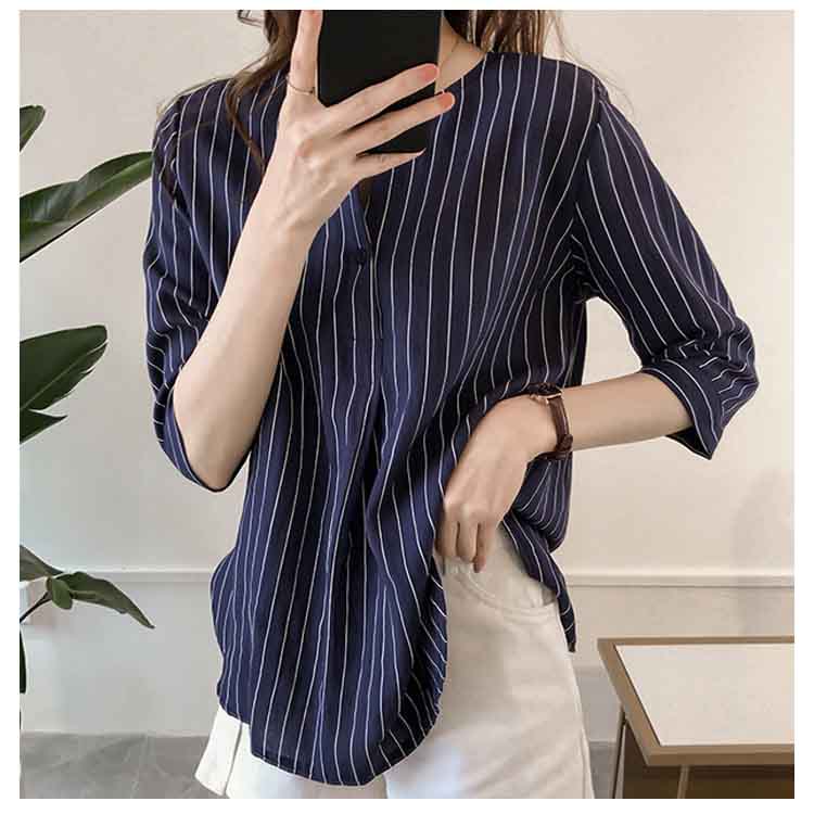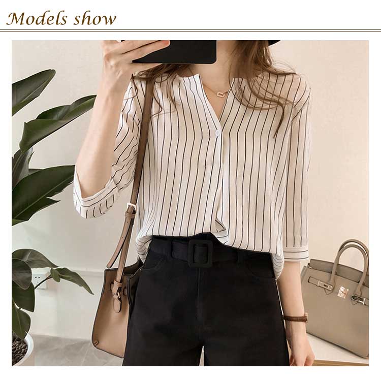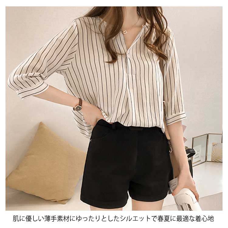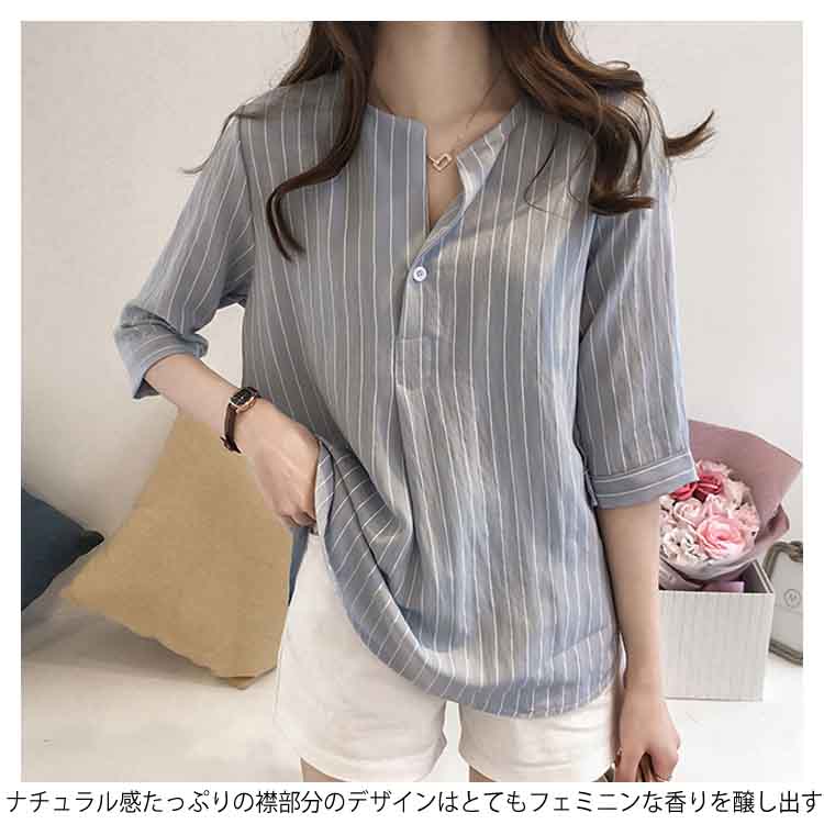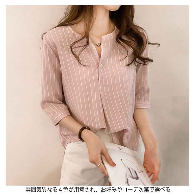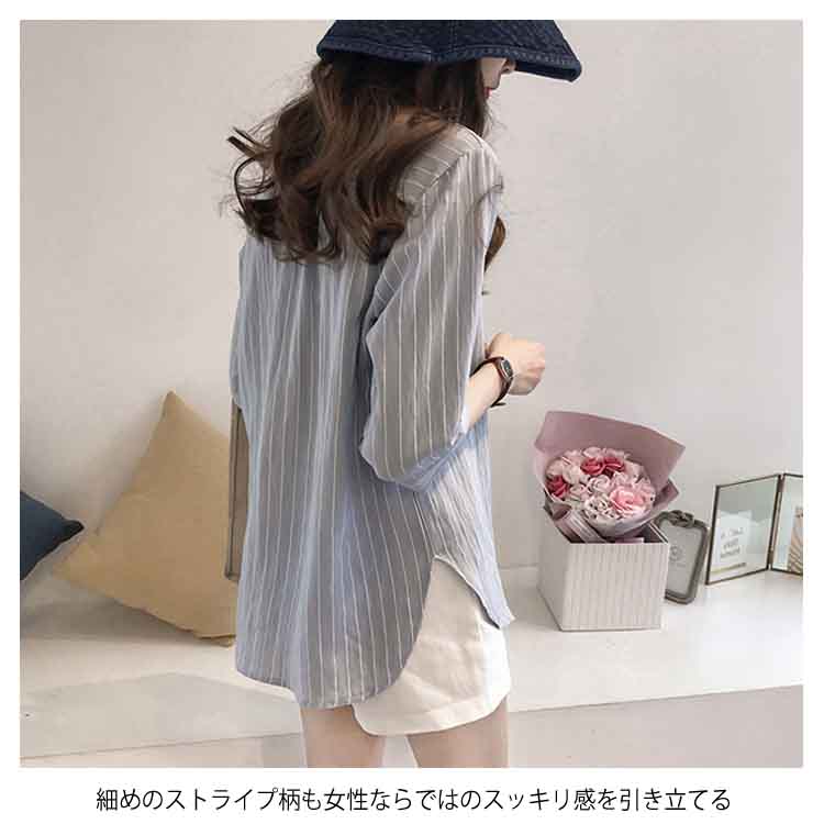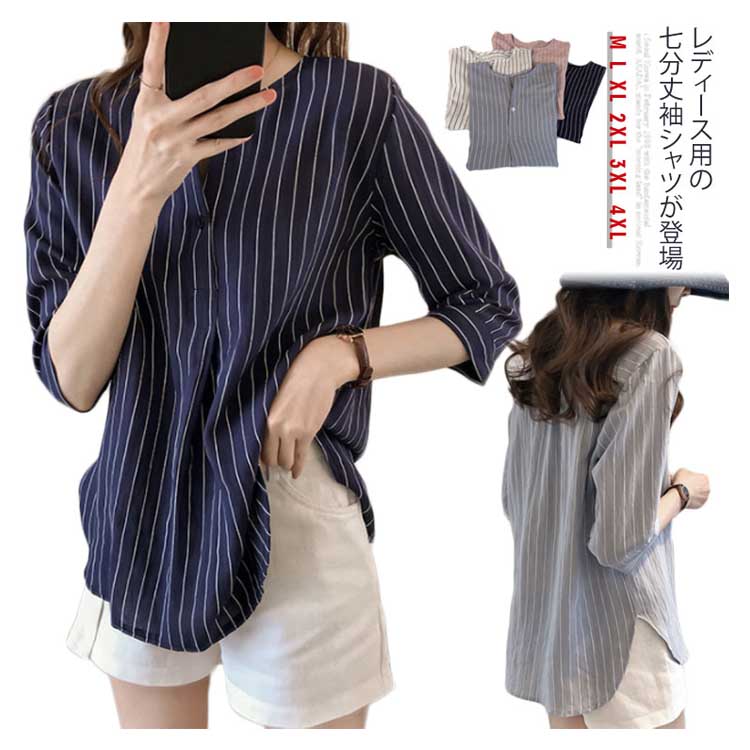 ブラウス 七分丈袖 レディース シャツ ストライプ柄 ゆったり 女性用 トップス 春 夏 薄手 着やせ 通勤 スッキリ オシャレ