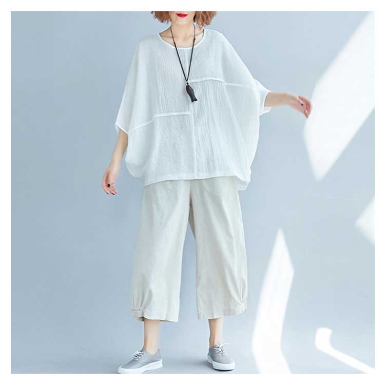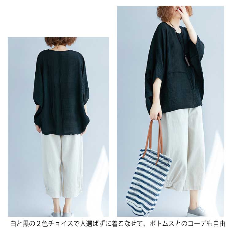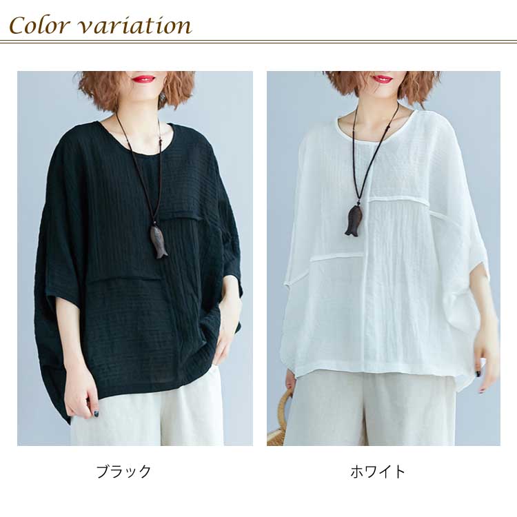 | レディース用の七分丈袖ブラウスが登場 ゆったりとしたシルエットに肌に優しい薄手麻混紡素材で春夏に爽やかな着心地 シンプルなデザインにナチュラル感たっぷりのカッティングでとても上品なイメージ ドルマンスリーブの仕様で体型カバーも果たせる 白と黒の2色チョイスで人選ばずに着こなせて、ボトムスとのコーデも自由 | |