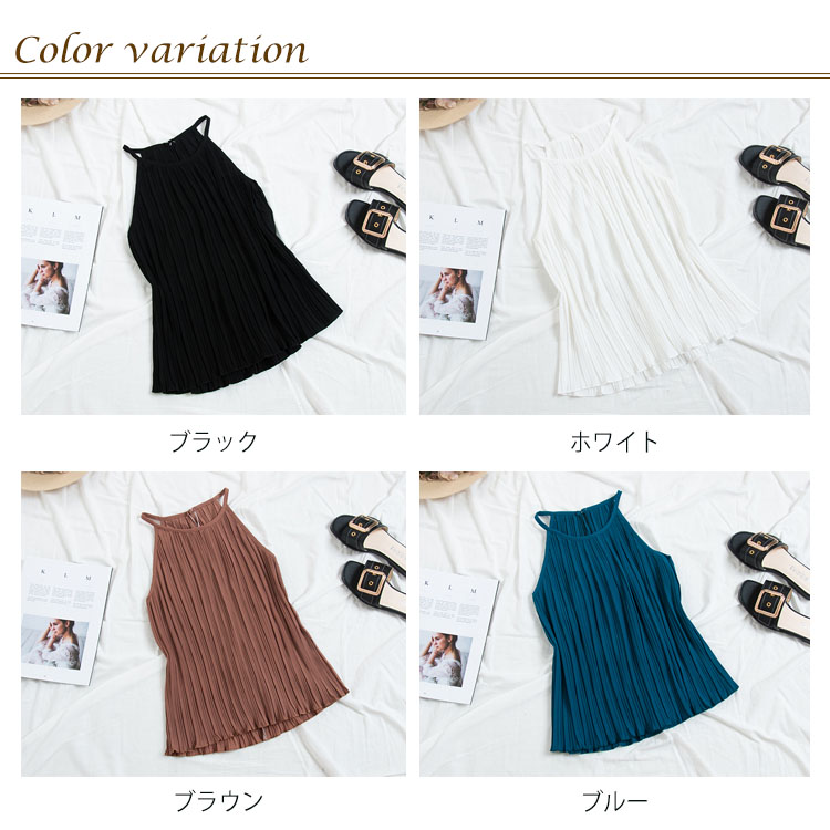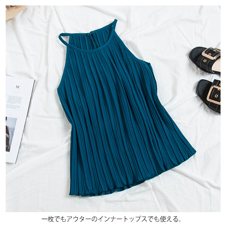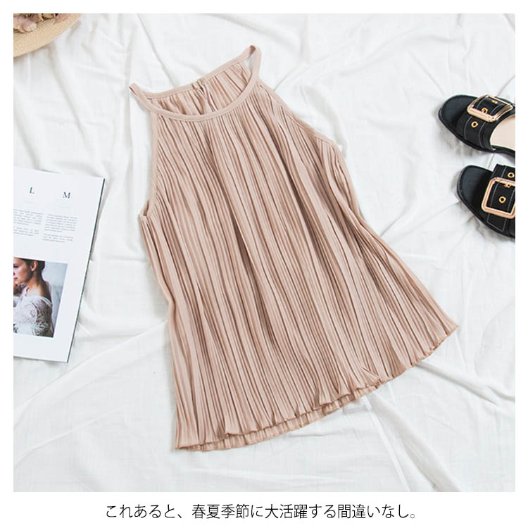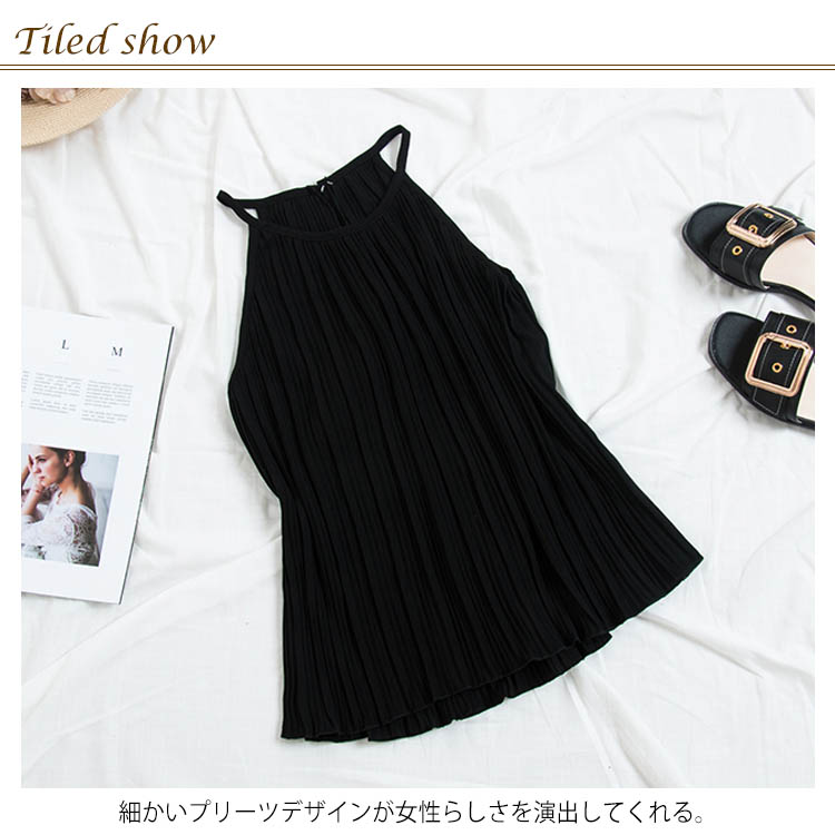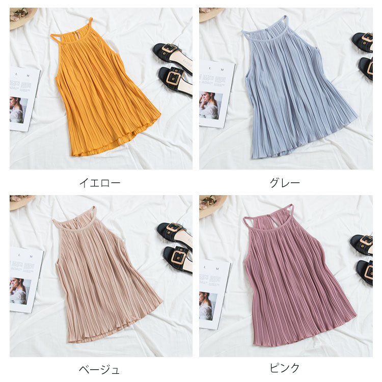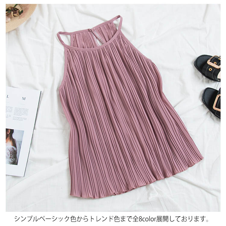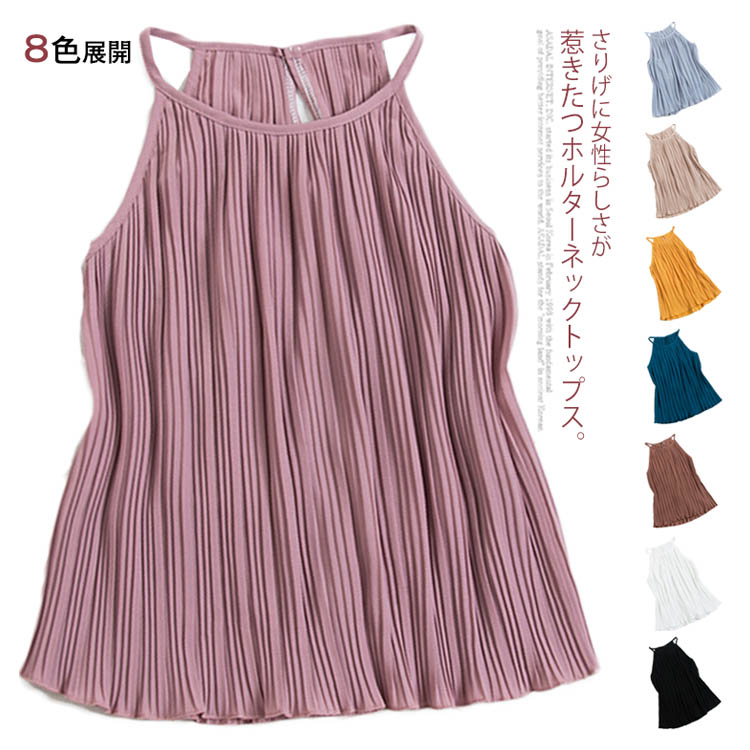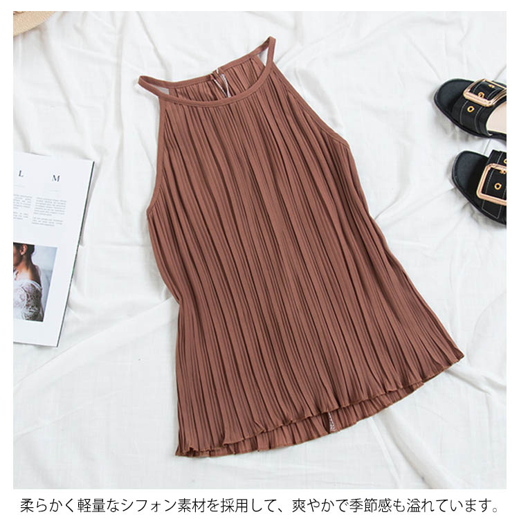 《送料無料》春色追加全8color!プリーツ加工 トップス ホルターネック ブラウス ノースリーブ プリーツブラウス キャミソール タンクトップ シフォン 夏服 シンプル 無地 おしゃれ 可愛い