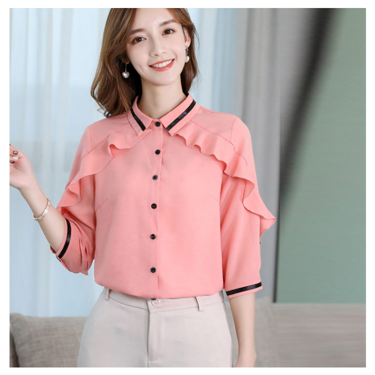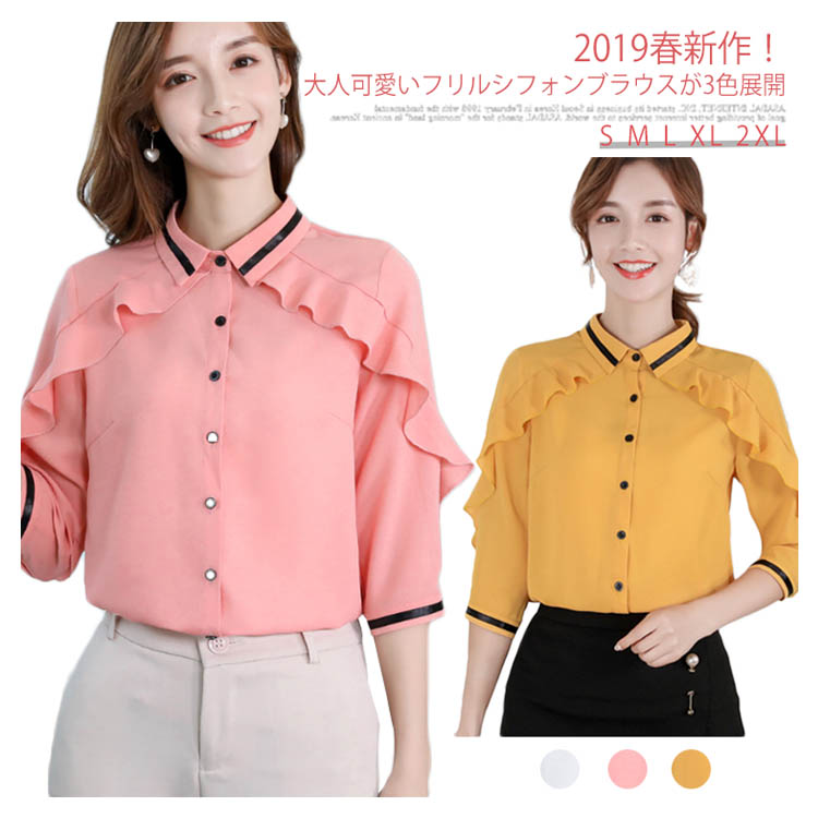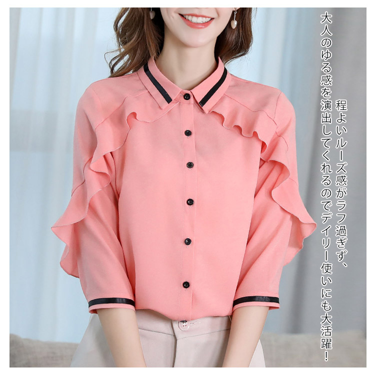 | 2019春新作!大人可愛いフリルシフォンブラウスが3色展開。 肩から袖にかけて、ボリュームフリルデザインが華やかな女性らしさを演出します。 シフォン素材を使用しているので、さらりとした着心地の良い生地感で、軽やかでシワになりにくいのが嬉しいポイントです! 一枚でシャツトップとしてもジャケットのINにしても大人ハンサムコーディネートに 程よいルーズ感がラフ過ぎず、大人のゆる感を演出してくれるのでデイリー使いにも大活躍! | |