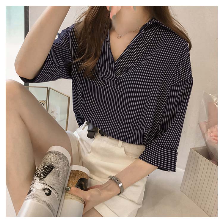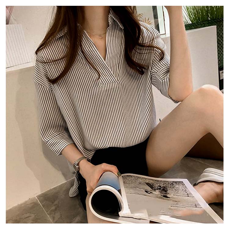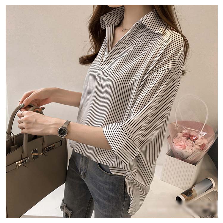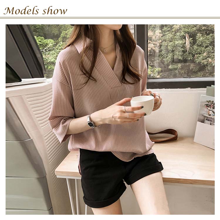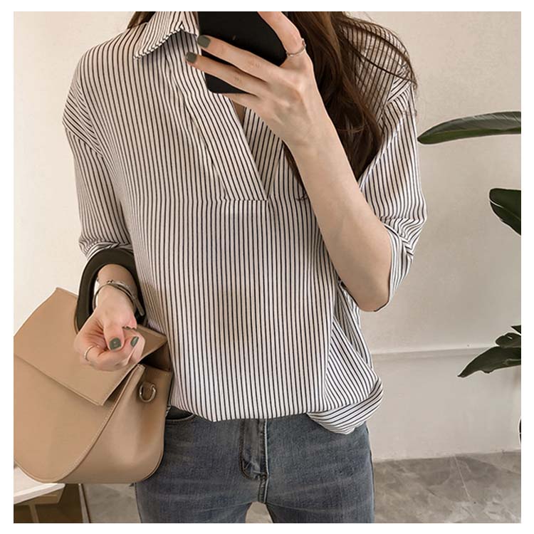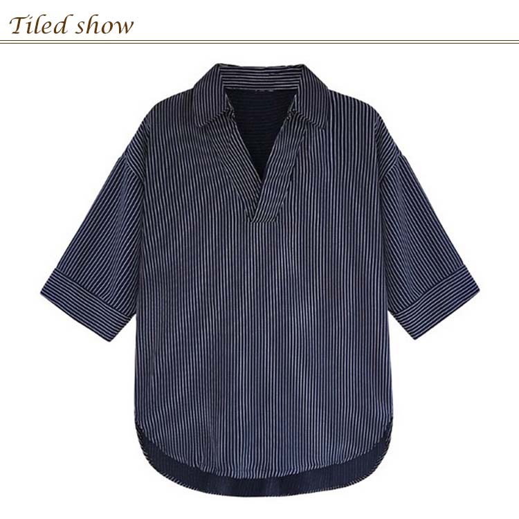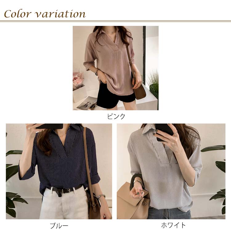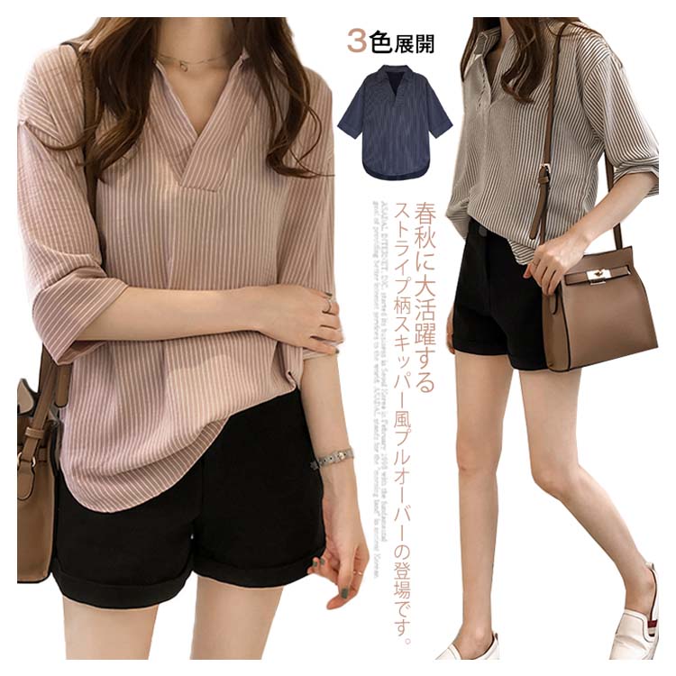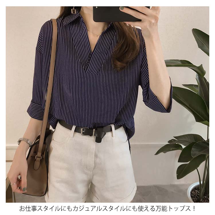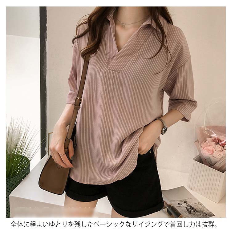 《送料無料》スキッパー風ストライプトップス レディース シャツ ブラウス ストライプ柄 プルオーバー Vネック 七分袖 柄 トップス ゆったり カジュアル 春 夏
