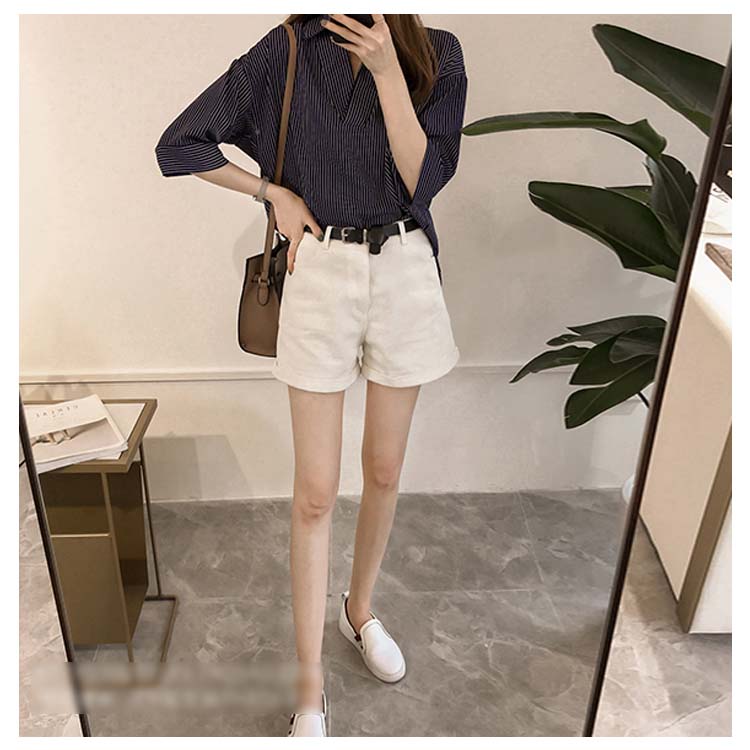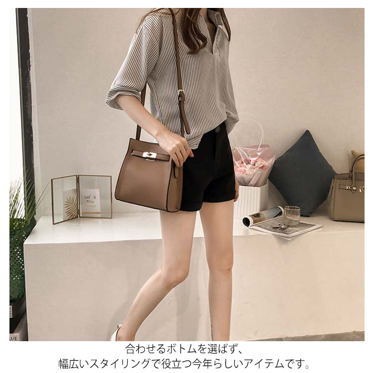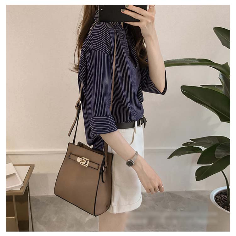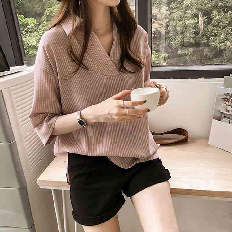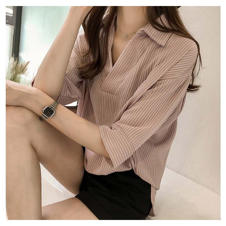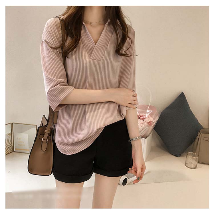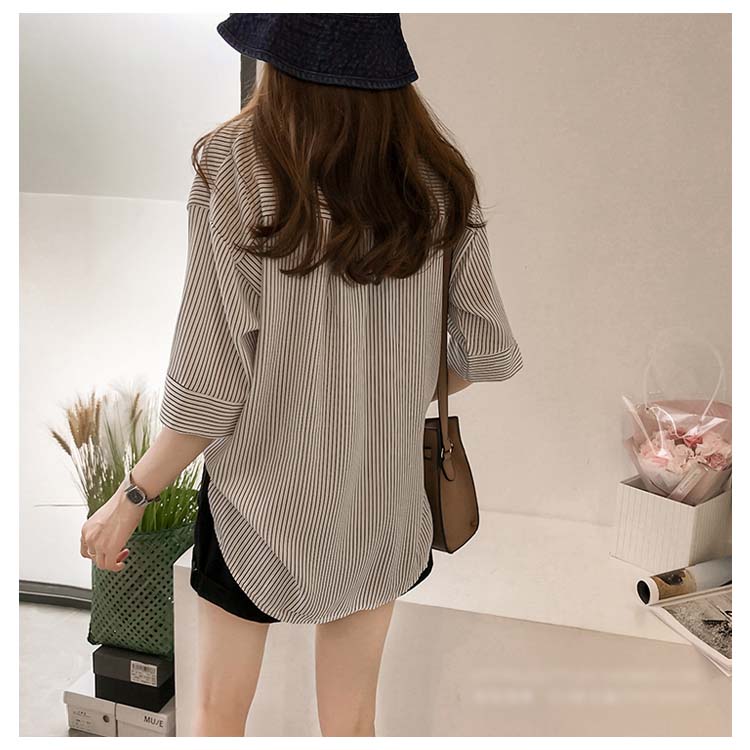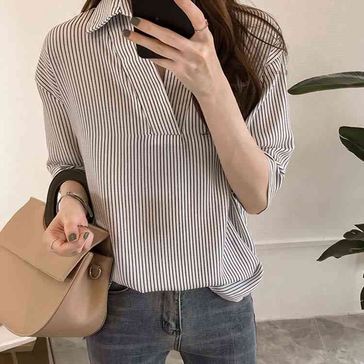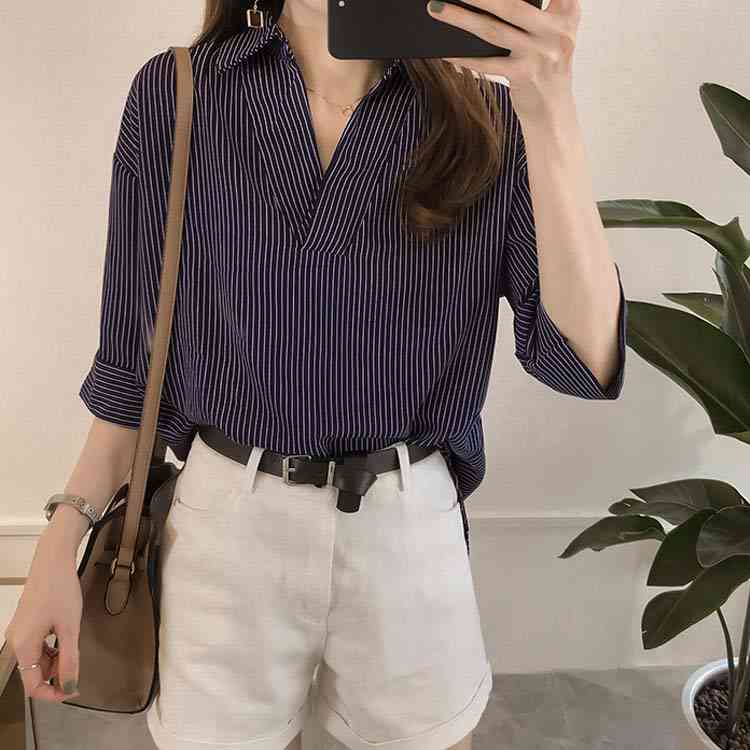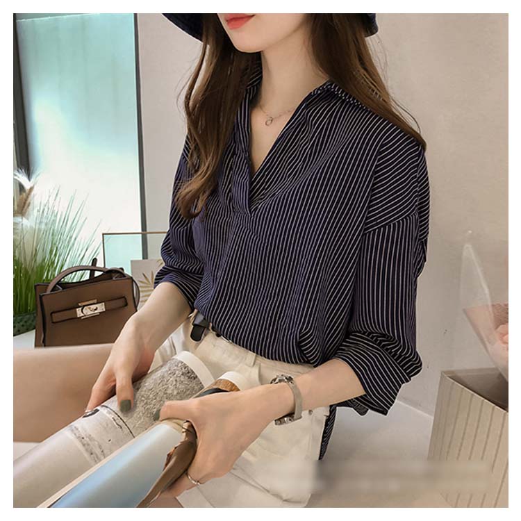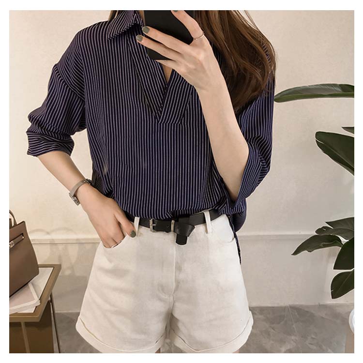 《送料無料》スキッパー風ストライプトップス レディース シャツ ブラウス ストライプ柄 プルオーバー Vネック 七分袖 柄 トップス ゆったり カジュアル 春 夏