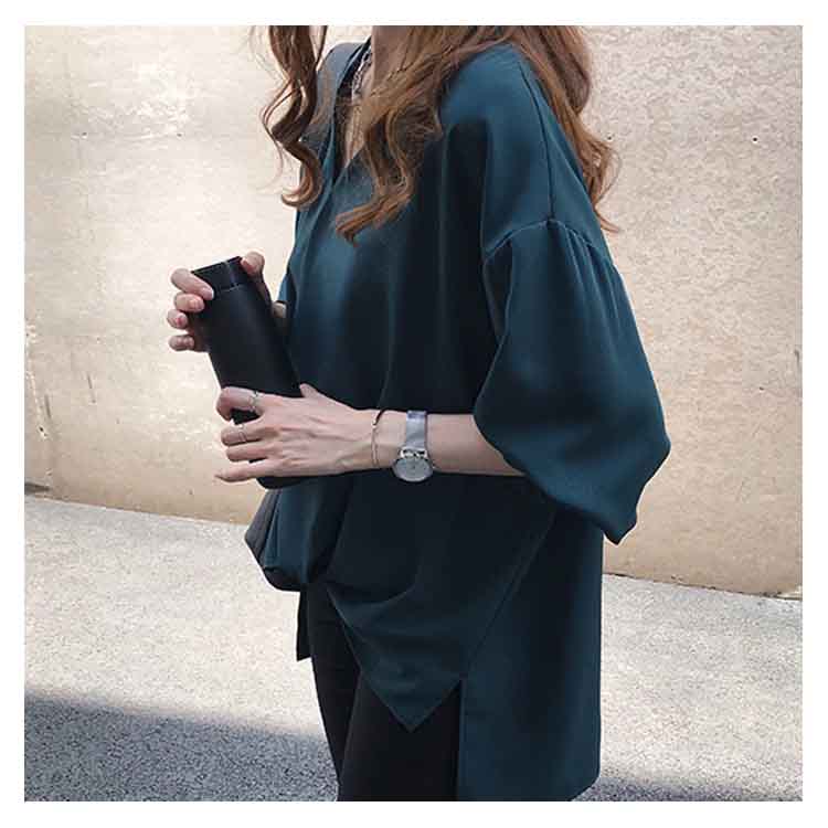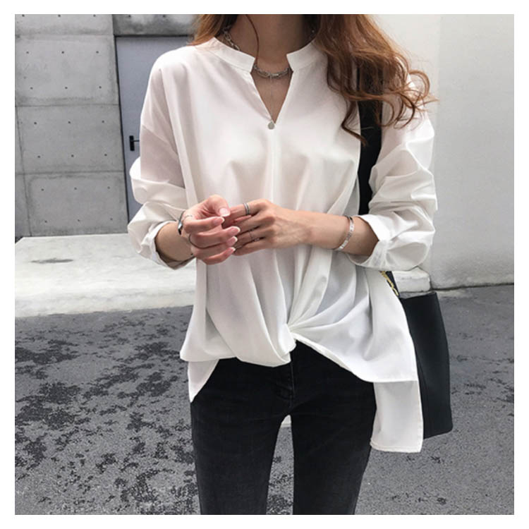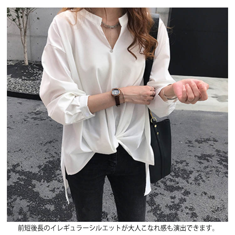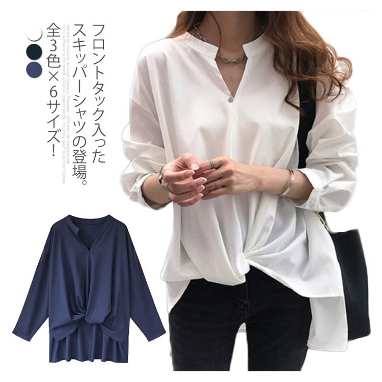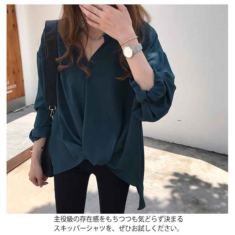 全3色×6サイズ!フロントギャザー絞り トップス ブラウスシャツ レディース チュニック Vネック ゆったり 体型カバー 春 秋 長袖 無地 大きサイズ