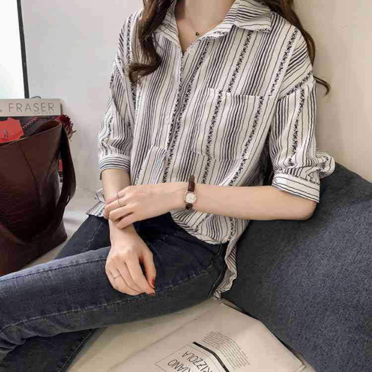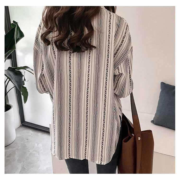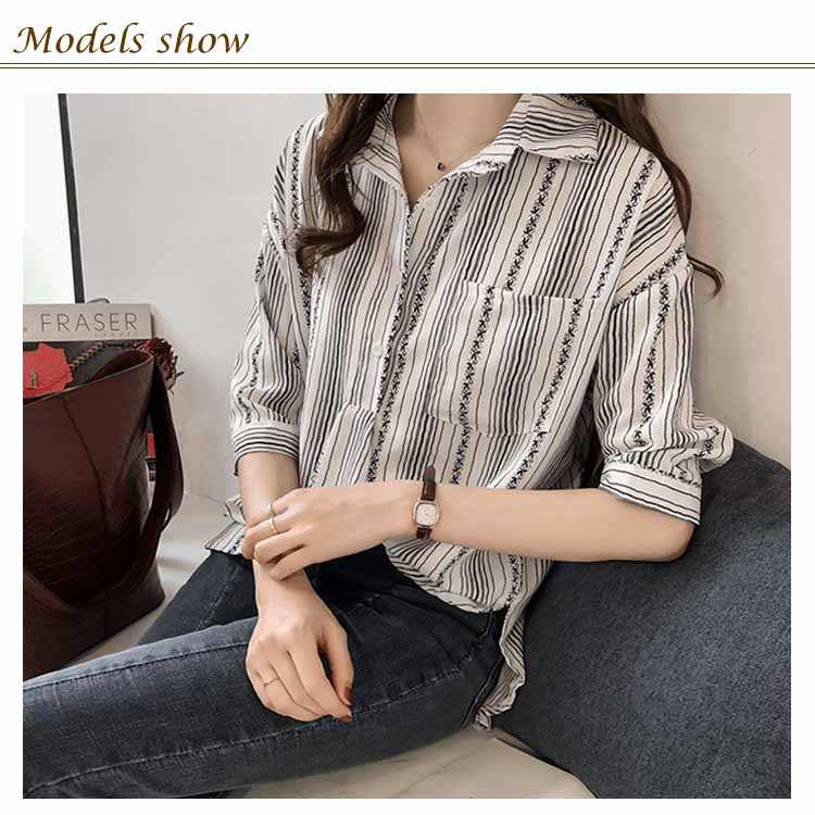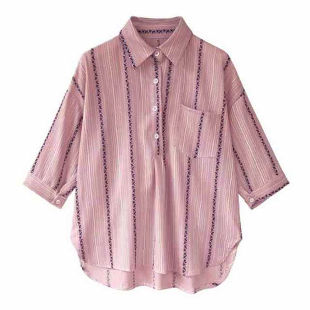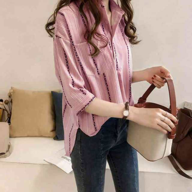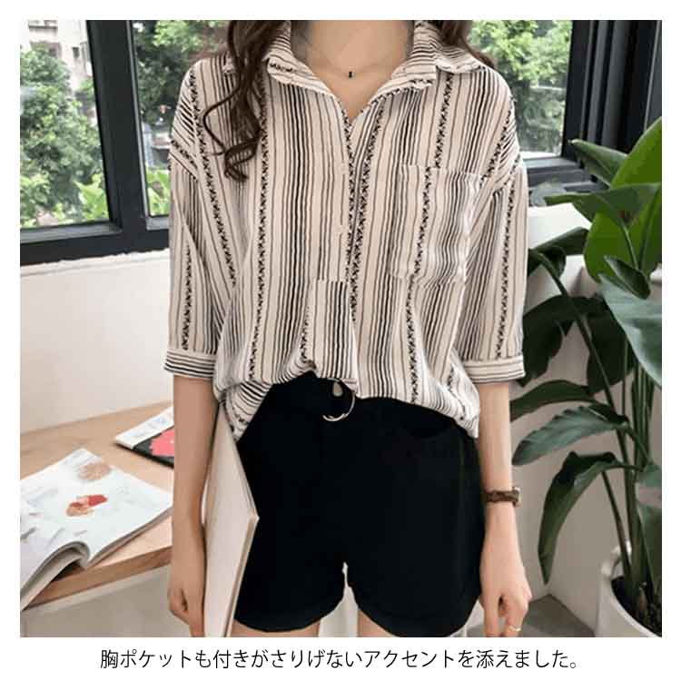 M-4XLサイズ!ブラウス シャツ トップス ストライブ柄 プルオーバー 縦ライン 胸ポケット付き バック長め レディース 大きサイズ 七分袖