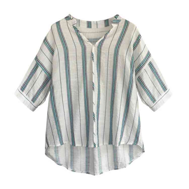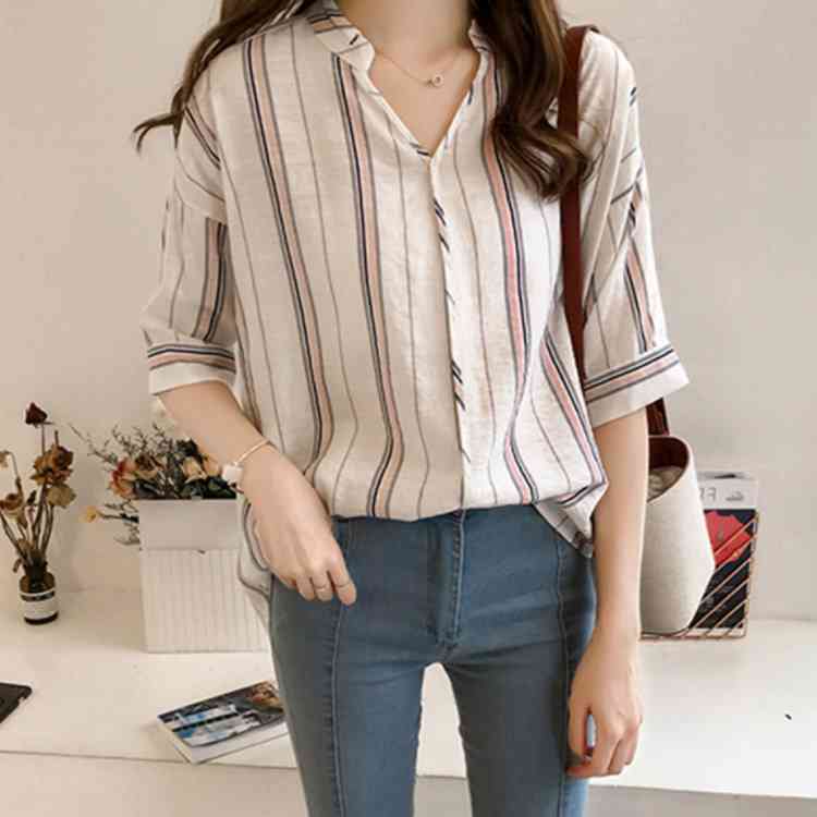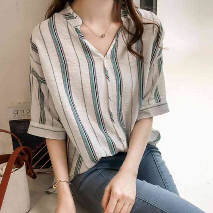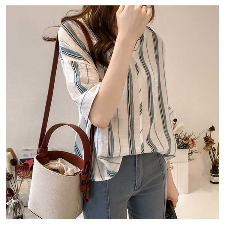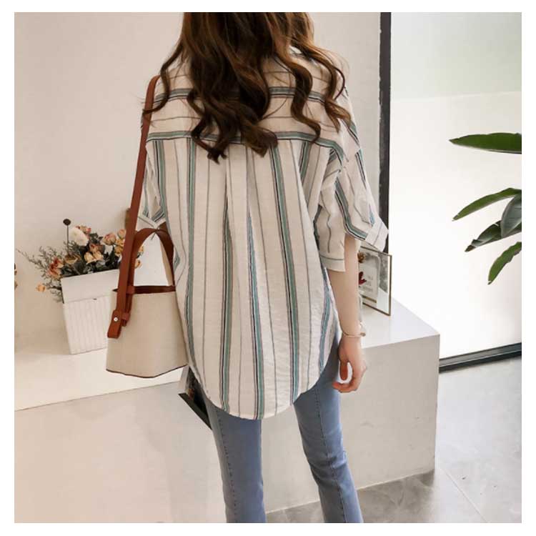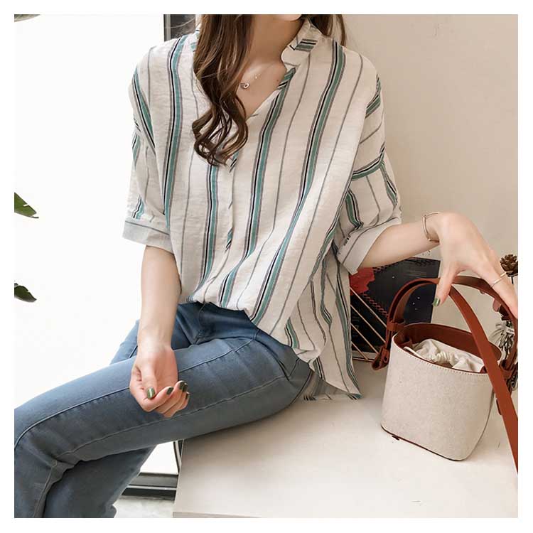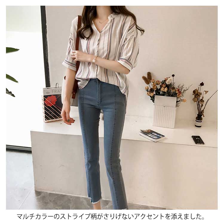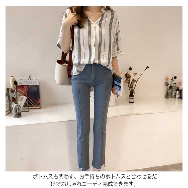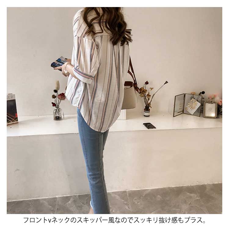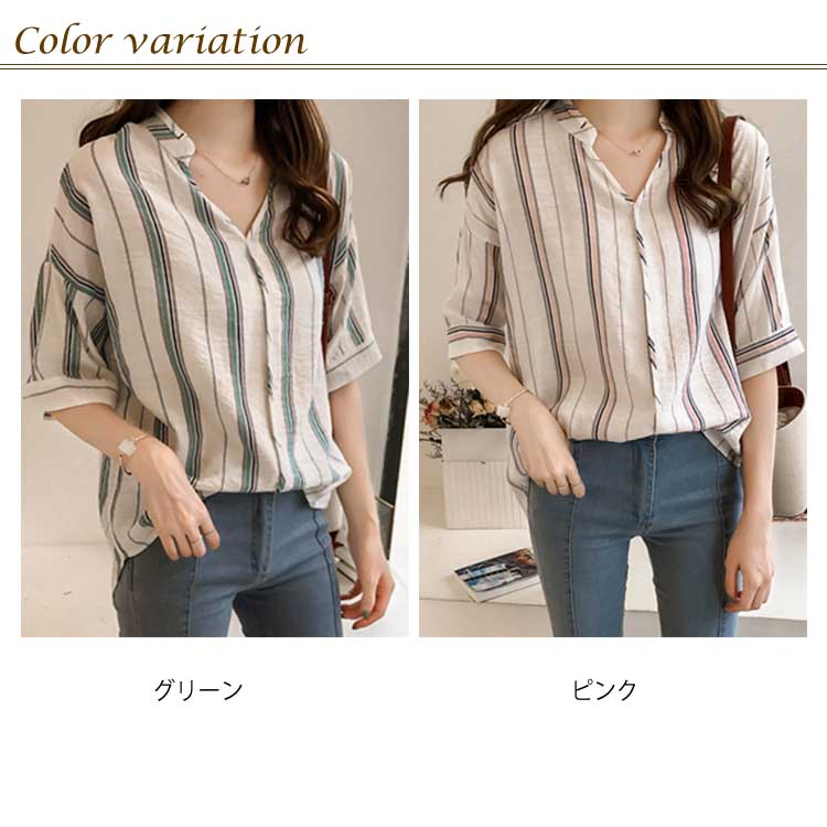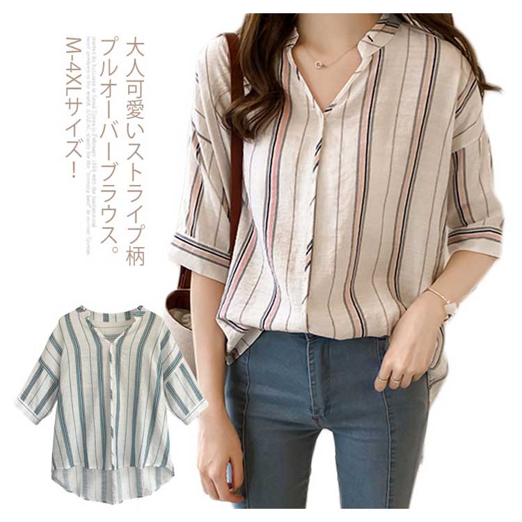 M-4XLサイズ!シャツ レディース 5分袖 トップス ブラウス ストライプ スキッパーシャツ ぷるオーバ0 トップス おしゃれ 可愛い 春 夏