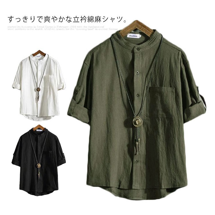 送料無料 綿麻シャツ カジュアルシャツ リネン シャツ 7分袖 ロールアップ 半袖 立衿 メンズ 無地 スタンドカラー 夏服 麻混 薄手 シンプル 春 秋