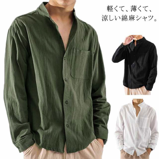送料無料 綿麻シャツ カジュアルシャツ リネン シャツ 長袖 立衿 メンズ 無地 スタンドカラー 夏服 麻混 薄手 シンプル ストリート系 春 秋 ショート丈