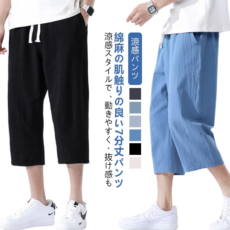 リネンパンツ メンズ 七分丈パンツ 綿麻 クロップドパンツ ひざ下 ワイドパンツ イージーパンツ 薄手 通気性 チノパン リネンパンツ ウエストゴム 大きいサイズ 無地 ゆったり カジュアル おしゃれ お出かけ おうちコーデ 夏 春 夏服 春服 送料無料