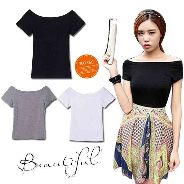 Tシャツ へそ出し オフショルダー ボートネック 肩出し シンプル タイト レディース ショート丈 ジャズ トップス セクシー スリム 半袖 上着き