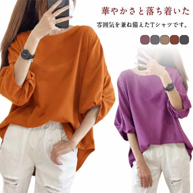 レディース 7分袖 春夏 Tシャツ トップス パフスリーブ 無地 可愛い 秋物 七分袖 丸首 カットソー おしゃれ ゆったり 大きいサイズ きれいめ 体型カバー カジュアル シンプル 送料無料
