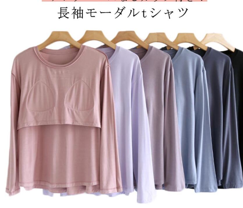 カットソー 長袖 カップ付き Tシャツ アンダーゴムなしカップ トップス ラウンドネック アンダー パット付 長袖tシャツ ロンT インナー 締め付けない 敏感肌 柔らかい 生地 透けない 一体型カップ ブラカップ 大人 ルームウェア ナイトブラ 部屋着 ストレッチ 伸縮性