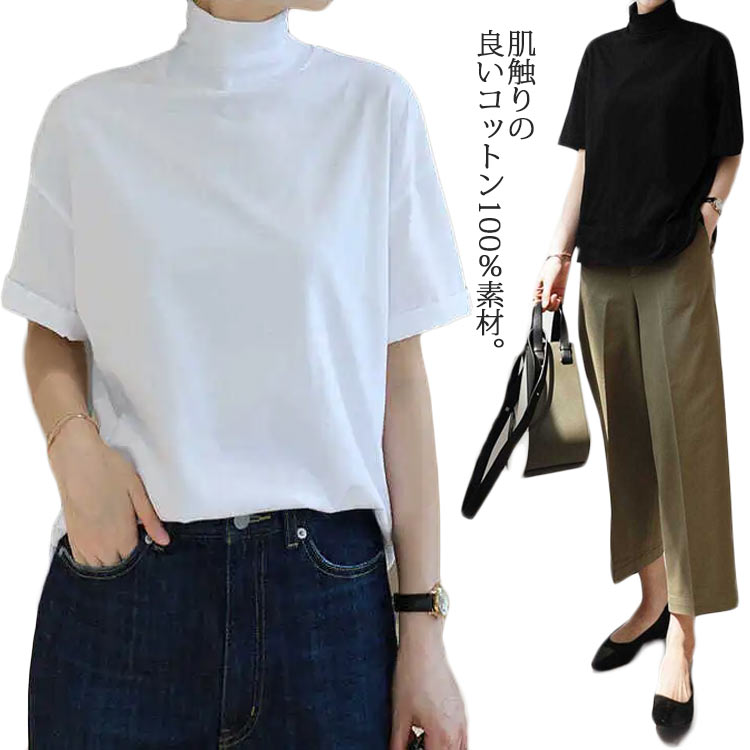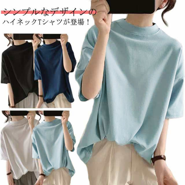 ハイネック Tシャツ レディース 夏 半袖 涼しい トップス タートルネック カットソー ゆるT ボトルネック ゆったり 無地 おしゃれ 夏服 半袖tシャツ 半袖シャツ シンプル 春夏 韓国 白 黒 20代 30代 40代