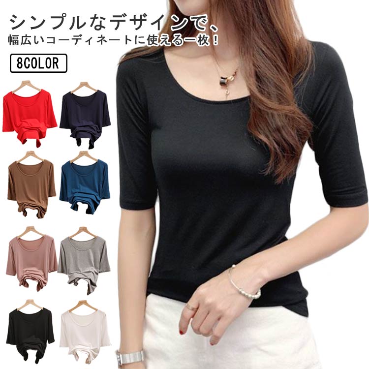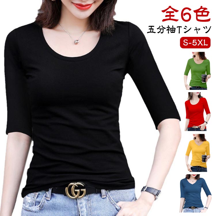 tシャツ レディース 五分袖 全6色 Uネック/Vネック カットソー 5分袖Tシャツ きれいめ 細身 夏 ストレッチ トップス 春秋 シンプル 白 黒 無地tシャツ タイト スリム インナー 送料無料