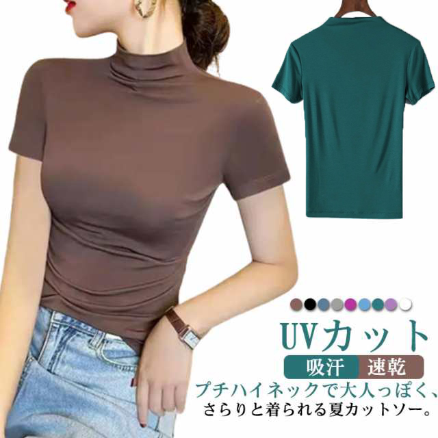 UVカット プチハイネック 夏 カットソー ハイネック 半袖 吸汗 速乾 シンプル 無地 半袖 レディース シンプル 送料無料 きれいめ ブラウス カットソー 夏