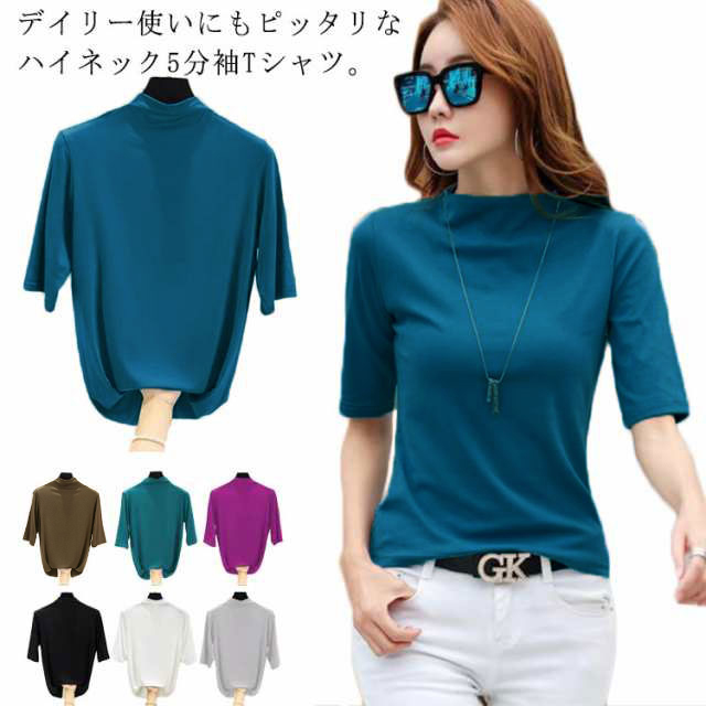 tシャツ カットソー レディース トップス 5分袖 五分袖 半袖tシャツ 半袖シャツ タートルネック ハイネック ゆったり 大きいサイズ 無地 おしゃれ 春夏 春 夏 秋 春秋