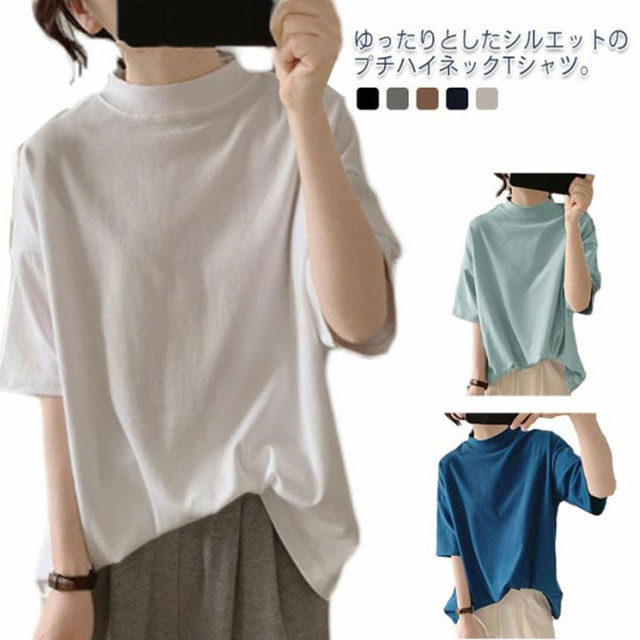 プチハイネック tシャツ レディース 春夏 ゆったり シンプル 半袖 綿100% トップス 韓国ファッション 可愛い 無地 コットン ドロップショルダー ボトルネック おしゃれ モックネック 5分袖 二の腕カバー 送料無料