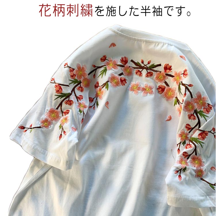 Tシャツ レディース 半袖 花柄 刺繍 tシャツ カットソー 春 夏 Uネック クルーネック トップス 薄手 綿混 コットン混 カジュアル きれいめ おしゃれ 夏服 夏物 送料無料