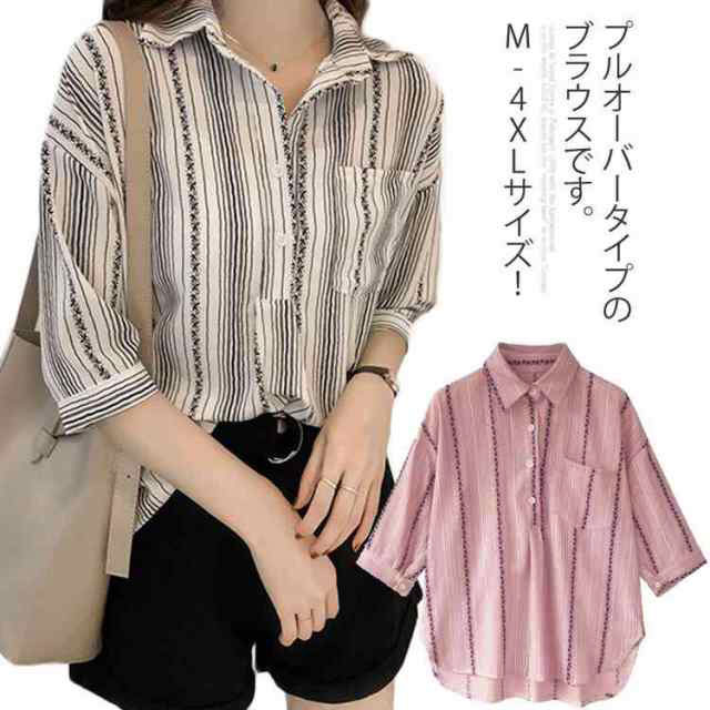 M-4XLサイズ!シャツ レディース 5分袖 トップス ブラウス ストライプ スキッパーシャツ ぷるオーバ0 トップス おしゃれ 可愛い 春 夏