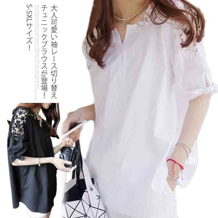 S-5XLサイズ!レースブラウス レディース レース刺繍 チュニックブラウス シャツ ブラウス チュニック トップス プルオーバー かわいい 黒 白 大きサイズ 春夏 半袖