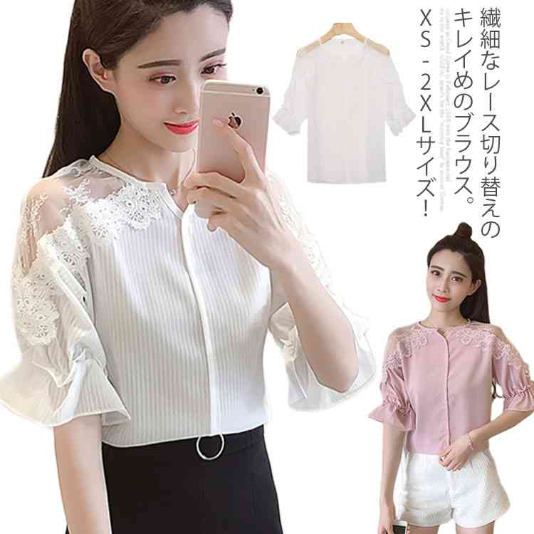 XS-2XLサイズ!ブラウス レディース トップス シャツ カジュアル レース 透け感 大人 可愛い ホワイト ピンク 春 夏