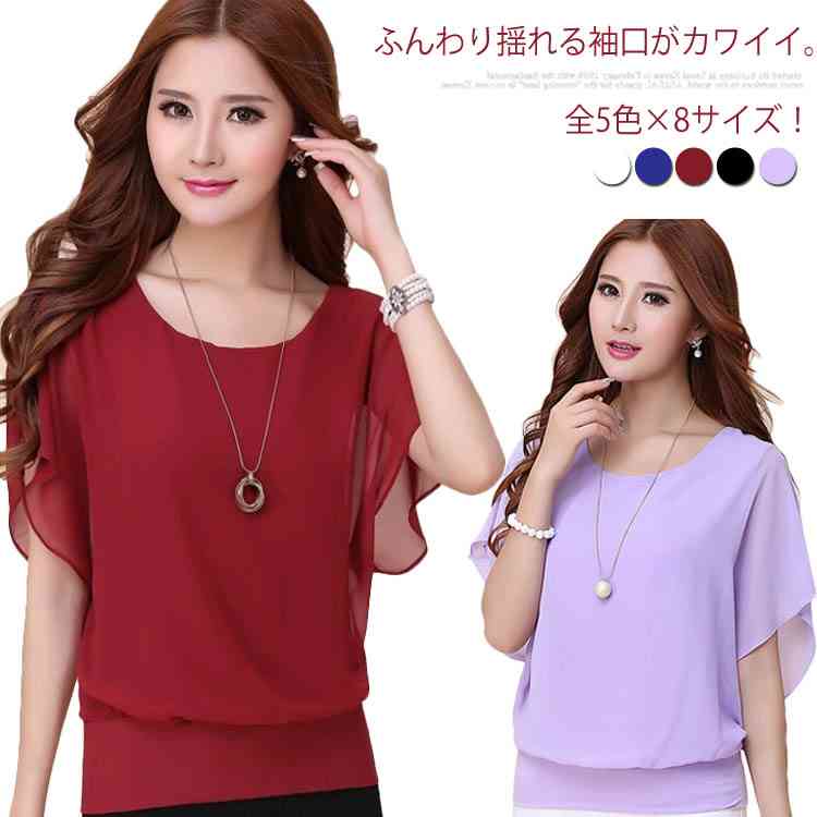 全5色×8サイズ!ブラウス レディース トップス ラウンドネック シフォントップス 春夏 半袖 ドルマン とろみ チュニック 体型カバー 無地 春 夏 大きサイズ