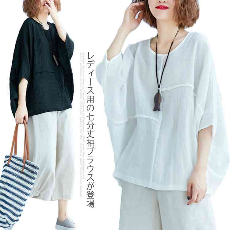 ブラウス 七分丈袖 ゆったり レディース リネン Tシャツ ドルマンスリーブ 体型カバー 女性用 薄手 トップス 爽やか 夏物 カジュアル レトロ