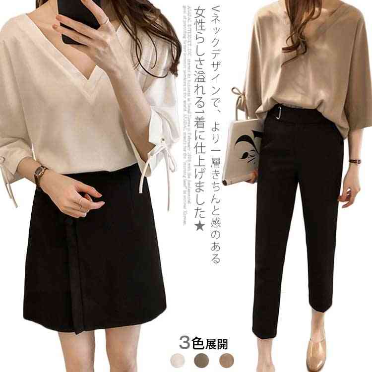 送料無料/シャツ レディース シフォンブラウス シャツブラウス スキッパー Vネック 七分袖 リボン付き フレア 無地 シンプル ゆったり 薄手 お洒落 キレイめ フェミニン レトロ トップス 春物 夏物 夏新作