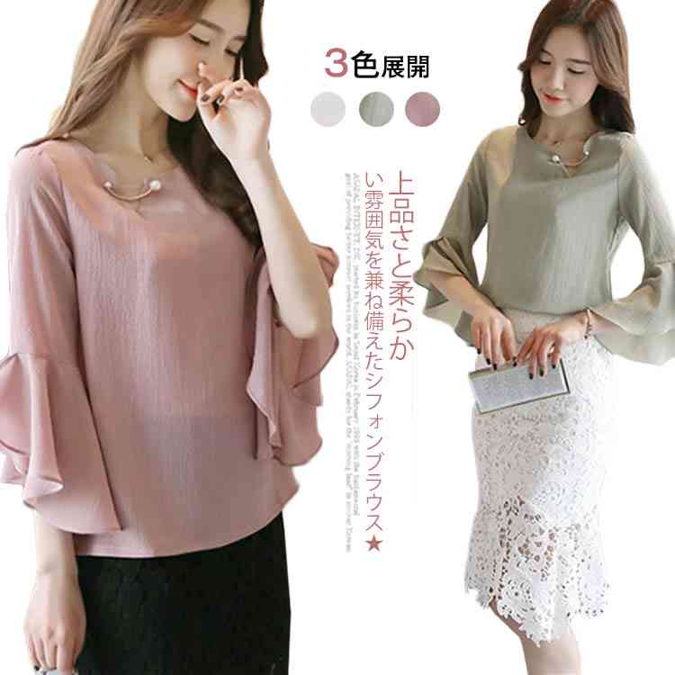 送料無料 シフォン トップス ブラウス シャツ レディース フリル袖 無地 シンプル カットソー ポイント消化